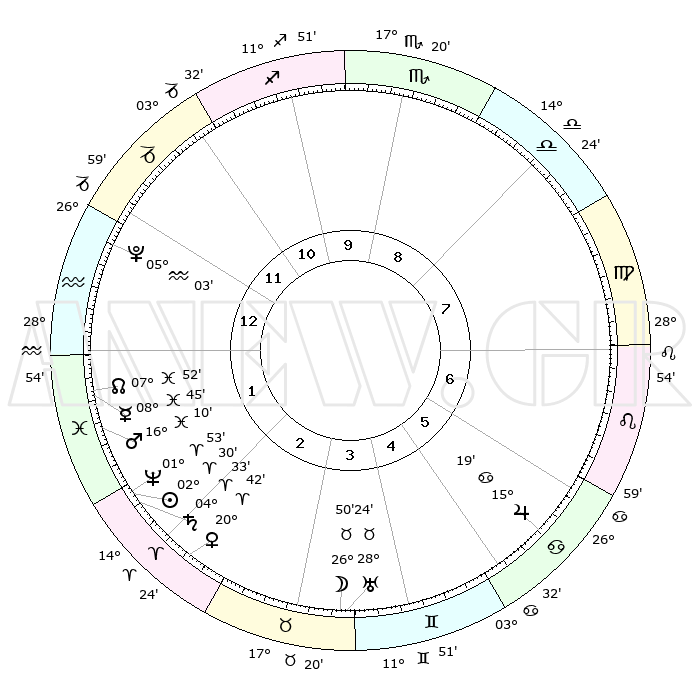 | | ΘΕΣΕΙΣ ΠΛΑΝΗΤΩΝ ΑΣΤΡΟΛΟΓΙΚΟΥ ΧΑΡΤΗ ΤΗΣ ΣΤΙΓΜΗΣ ΑΥΤΗΣ | | | | Πλανήτης | Ζώδιο | Μοίρες | Δεκαήμ. | Σε οίκο | Απόκλιση | | Ακμές των οίκων | | Ηλιος | Κριός | 02°25' | Πρώτο | 2 | 00 N 58 | | 1ος | 22°31' | Αιγόκερως | | Σελήνη | Ταύρος | 25°42' | Τρίτο | 4 | 24 N 08 | | 2ος | 05°12' | Ιχθείς | | Ερμής | Ιχθείς | 08°44' | Πρώτο | 2 | 07 S 52 | | 3ος | 14°40' | Κριός | | Αφροδίτη | Κριός | 20°36' | Τρίτο | 3 | 07 N 19 | | 4ος | 14°28' | Ταύρος | | Αρης | Ιχθείς | 16°07' | Δεύτερο | 2 | 06 S 28 | | 5ος | 07°52' | Δίδυμοι | | Δίας | Καρκίνος | 15°19' | Δεύτερο | 6 | 22 N 55 | | 6ος | 29°06' | Δίδυμοι | | Κρόνος | Κριός | 04°33' | Πρώτο | 2 | 00 S 09 | | 7ος | 22°31' | Καρκίνος | | Ουρανός | Ταύρος | 28°24' | Τρίτο | 4 | 19 N 38 | | 8ος | 05°12' | Παρθένος | | Ποσειδώνας | Κριός | 01°52' | Πρώτο | 2 | 00 S 27 | | 9ος | 14°40' | Ζυγός | | Πλούτωνας | Υδροχόος | 05°03' | Πρώτο | 1 | 22 S 48 | | 10ος | 14°28' | Σκορπιός | | Β. Δεσμός | Ιχθείς | 07°53' | Πρώτο | 2 | 08 S 37 | | 11ος | 07°52' | Τοξότης | | Ωροσκόπος | Αιγόκερως | 22°31' | Τρίτο | | | 12ος | 29°06' | Τοξότης | | Μεσουράνημα | Σκορπιός | 14°28' | Δεύτερο | | | |