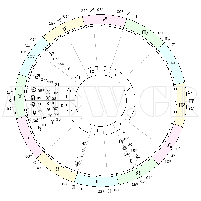 | | ΘΕΣΕΙΣ ΠΛΑΝΗΤΩΝ ΑΣΤΡΟΛΟΓΙΚΟΥ ΧΑΡΤΗ ΤΗΣ ΣΤΙΓΜΗΣ ΑΥΤΗΣ | | | | Πλανήτης | Ζώδιο | Μοίρες | Δεκαήμ. | Σε οίκο | Απόκλιση | | Ακμές των οίκων | | Ηλιος | Ιχθείς | 08°34' | Πρώτο | 1 | 08 S 21 | | 1ος | 16°19' | Υδροχόος | | Σελήνη | Καρκίνος | 13°29' | Δεύτερο | 5 | 27 N 05 | | 2ος | 02°04' | Κριός | | Ερμής | Ιχθείς | 22°30'R | Τρίτο | 1 | 00 S 15 | | 3ος | 07°31' | Ταύρος | | Αφροδίτη | Ιχθείς | 20°56' | Τρίτο | 1 | 04 S 52 | | 4ος | 03°29' | Δίδυμοι | | Αρης | Υδροχόος | 27°19' | Τρίτο | 1 | 13 S 26 | | 5ος | 25°25' | Δίδυμοι | | Δίας | Καρκίνος | 15°19'R | Δεύτερο | 5 | 22 N 54 | | 6ος | 17°45' | Καρκίνος | | Κρόνος | Κριός | 01°37' | Πρώτο | 1 | 01 S 19 | | 7ος | 16°19' | Λέων | | Ουρανός | Ταύρος | 27°42' | Τρίτο | 3 | 19 N 28 | | 8ος | 02°04' | Ζυγός | | Ποσειδώνας | Κριός | 00°59' | Πρώτο | 1 | 00 S 48 | | 9ος | 07°31' | Σκορπιός | | Πλούτωνας | Υδροχόος | 04°29' | Πρώτο | 12 | 22 S 53 | | 10ος | 03°29' | Τοξότης | | Β. Δεσμός | Ιχθείς | 09°09' | Πρώτο | 1 | 08 S 08 | | 11ος | 25°25' | Τοξότης | | Ωροσκόπος | Υδροχόος | 16°19' | Δεύτερο | | | 12ος | 17°45' | Αιγόκερως | | Μεσουράνημα | Τοξότης | 03°29' | Πρώτο | | | |