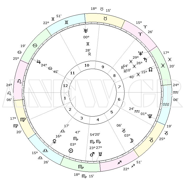 | | ΘΕΣΕΙΣ ΠΛΑΝΗΤΩΝ ΑΣΤΡΟΛΟΓΙΚΟΥ ΧΑΡΤΗ ΤΗΣ ΣΤΙΓΜΗΣ ΑΥΤΗΣ | | | | Πλανήτης | Ζώδιο | Μοίρες | Δεκαήμ. | Σε οίκο | Απόκλιση | | Ακμές των οίκων | | Ηλιος | Σκορπιός | 03°41' | Πρώτο | 4 | 12 S 45 | | 1ος | 25°14' | Καρκίνος | | Σελήνη | Αιγόκερως | 01°55' | Πρώτο | 6 | 28 S 23 | | 2ος | 15°60' | Λέων | | Ερμής | Σκορπιός | 27°13' | Τρίτο | 5 | 22 S 12 | | 3ος | 10°25' | Παρθένος | | Αφροδίτη | Ζυγός | 16°10' | Δεύτερο | 4 | 04 S 57 | | 4ος | 10°48' | Ζυγός | | Αρης | Σκορπιός | 23°50' | Τρίτο | 5 | 19 S 03 | | 5ος | 16°54' | Σκορπιός | | Δίας | Καρκίνος | 24°45' | Τρίτο | 12 | 21 N 15 | | 6ος | 23°24' | Τοξότης | | Κρόνος | Ιχθείς | 26°11'R | Τρίτο | 9 | 03 S 48 | | 7ος | 25°14' | Αιγόκερως | | Ουρανός | Δίδυμοι | 00°28'R | Πρώτο | 11 | 20 N 02 | | 8ος | 15°60' | Υδροχόος | | Ποσειδώνας | Ιχθείς | 29°54'R | Τρίτο | 9 | 01 S 18 | | 9ος | 10°25' | Ιχθείς | | Πλούτωνας | Υδροχόος | 01°24' | Πρώτο | 7 | 23 S 31 | | 10ος | 10°48' | Κριός | | Β. Δεσμός | Ιχθείς | 15°40' | Δεύτερο | 9 | 05 S 39 | | 11ος | 16°54' | Ταύρος | | Ωροσκόπος | Καρκίνος | 25°14' | Τρίτο | | | 12ος | 23°24' | Δίδυμοι | | Μεσουράνημα | Κριός | 10°48' | Δεύτερο | | | |