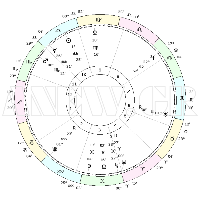 | ΘΕΣΕΙΣ ΠΛΑΝΗΤΩΝ ΑΣΤΡΟΛΟΓΙΚΟΥ ΧΑΡΤΗ ΤΗΣ ΣΤΙΓΜΗΣ ΑΥΤΗΣ | | Πλανήτης | Ζώδιο | Μοίρες | Δεκαήμ. | Σε οίκο | Απόκλιση | | Ακμές των οίκων | Ηλιος | Ζυγός | 11°18' | Δεύτερο | 11 | 04 S 28 | | 1ος | 06°27' | Σκορπιός | Σελήνη | Ιχθείς | 02°31' | Πρώτο | 4 | 11 S 54 | | 2ος | 05°17' | Τοξότης | Ερμής | Ζυγός | 26°19' | Τρίτο | 12 | 10 S 37 | | 3ος | 07°48' | Αιγόκερως | Αφροδίτη | Παρθένος | 18°07' | Δεύτερο | 11 | 05 N 57 | | 4ος | 12°27' | Υδροχόος | Αρης | Σκορπιός | 08°06' | Πρώτο | 1 | 14 S 19 | | 5ος | 15°15' | Ιχθείς | Δίας | Καρκίνος | 22°51' | Τρίτο | 9 | 21 N 31 | | 6ος | 13°17' | Κριός | Κρόνος | Ιχθείς | 27°39'R | Τρίτο | 5 | 03 S 15 | | 7ος | 06°27' | Ταύρος | Ουρανός | Δίδυμοι | 01°08'R | Πρώτο | 7 | 20 N 11 | | 8ος | 05°17' | Δίδυμοι | Ποσειδώνας | Κριός | 00°27'R | Πρώτο | 5 | 01 S 05 | | 9ος | 07°48' | Καρκίνος | Πλούτωνας | Υδροχόος | 01°23'R | Πρώτο | 3 | 23 S 32 | | 10ος | 12°27' | Λέων | Β. Δεσμός | Ιχθείς | 16°52' | Δεύτερο | 5 | 05 S 11 | | 11ος | 15°15' | Παρθένος | Ωροσκόπος | Σκορπιός | 06°27' | Πρώτο | | | 12ος | 13°17' | Ζυγός | Μεσουράνημα | Λέων | 12°27' | Δεύτερο | | | |