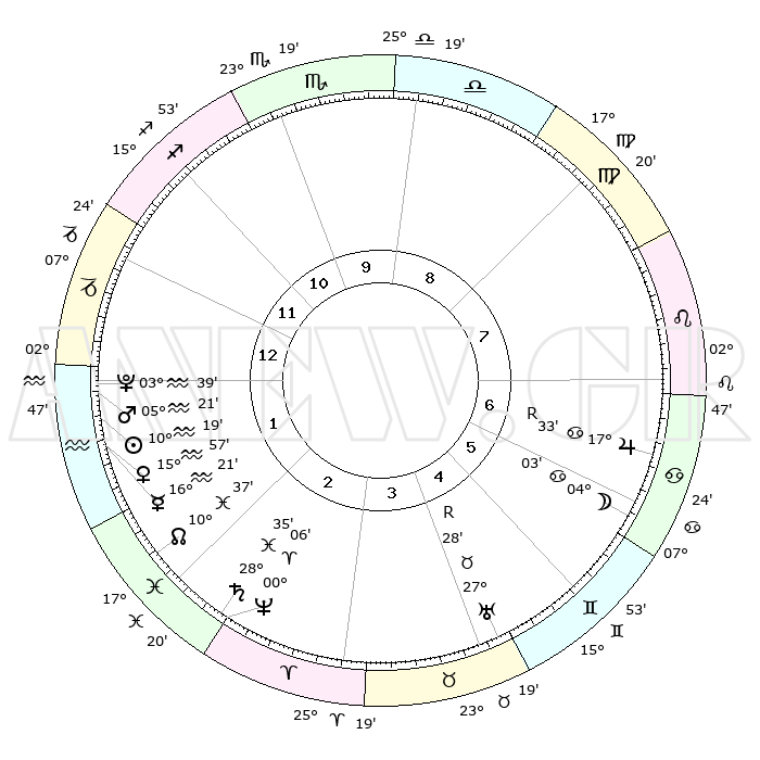 | | ΘΕΣΕΙΣ ΠΛΑΝΗΤΩΝ ΑΣΤΡΟΛΟΓΙΚΟΥ ΧΑΡΤΗ ΤΗΣ ΣΤΙΓΜΗΣ ΑΥΤΗΣ | | | | Πλανήτης | Ζώδιο | Μοίρες | Δεκαήμ. | Σε οίκο | Απόκλιση | | Ακμές των οίκων | | Ηλιος | Υδροχόος | 10°16' | Δεύτερο | 1 | 17 S 40 | | 1ος | 11°36' | Αιγόκερως | | Σελήνη | Καρκίνος | 03°17' | Πρώτο | 6 | 28 N 09 | | 2ος | 21°43' | Υδροχόος | | Ερμής | Υδροχόος | 16°15' | Δεύτερο | 1 | 17 S 51 | | 3ος | 01°59' | Κριός | | Αφροδίτη | Υδροχόος | 15°53' | Δεύτερο | 1 | 17 S 21 | | 4ος | 03°52' | Ταύρος | | Αρης | Υδροχόος | 05°18' | Πρώτο | 1 | 19 S 57 | | 5ος | 28°29' | Ταύρος | | Δίας | Καρκίνος | 17°34'R | Δεύτερο | 7 | 22 N 35 | | 6ος | 19°47' | Δίδυμοι | | Κρόνος | Ιχθείς | 28°35' | Τρίτο | 2 | 02 S 34 | | 7ος | 11°36' | Καρκίνος | | Ουρανός | Ταύρος | 27°28'R | Τρίτο | 4 | 19 N 24 | | 8ος | 21°43' | Λέων | | Ποσειδώνας | Κριός | 00°06' | Πρώτο | 2 | 01 S 10 | | 9ος | 01°59' | Ζυγός | | Πλούτωνας | Υδροχόος | 03°39' | Πρώτο | 1 | 23 S 02 | | 10ος | 03°52' | Σκορπιός | | Β. Δεσμός | Ιχθείς | 10°38' | Δεύτερο | 2 | 07 S 35 | | 11ος | 28°29' | Σκορπιός | | Ωροσκόπος | Αιγόκερως | 11°36' | Δεύτερο | | | 12ος | 19°47' | Τοξότης | | Μεσουράνημα | Σκορπιός | 03°52' | Πρώτο | | | |
