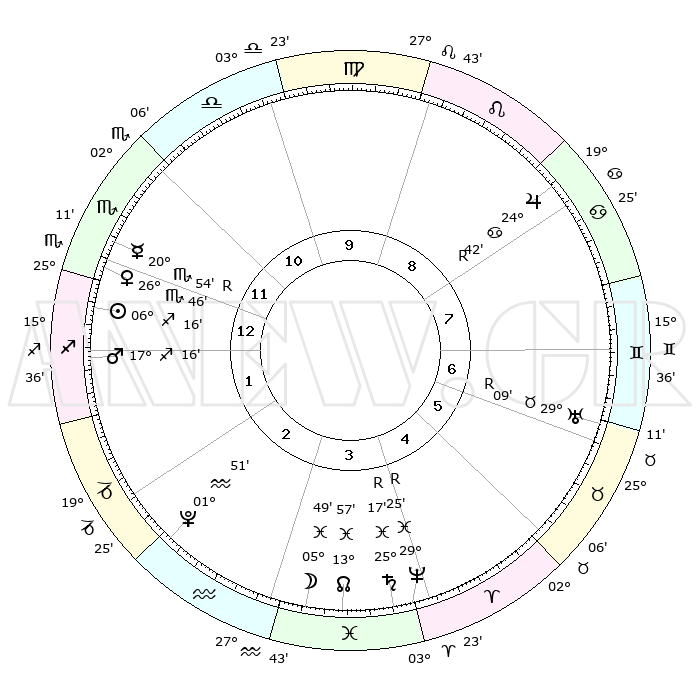 | | ΘΕΣΕΙΣ ΠΛΑΝΗΤΩΝ ΑΣΤΡΟΛΟΓΙΚΟΥ ΧΑΡΤΗ ΤΗΣ ΣΤΙΓΜΗΣ ΑΥΤΗΣ | | | | Πλανήτης | Ζώδιο | Μοίρες | Δεκαήμ. | Σε οίκο | Απόκλιση | | Ακμές των οίκων | | Ηλιος | Τοξότης | 06°14' | Πρώτο | 12 | 21 S 21 | | 1ος | 08°04' | Τοξότης | | Σελήνη | Ιχθείς | 05°30' | Πρώτο | 3 | 10 S 13 | | 2ος | 10°27' | Αιγόκερως | | Ερμής | Σκορπιός | 20°55'R | Τρίτο | 12 | 15 S 39 | | 3ος | 17°31' | Υδροχόος | | Αφροδίτη | Σκορπιός | 26°44' | Τρίτο | 12 | 18 S 38 | | 4ος | 23°34' | Ιχθείς | | Αρης | Τοξότης | 17°15' | Δεύτερο | 1 | 23 S 28 | | 5ος | 23°28' | Κριός | | Δίας | Καρκίνος | 24°42'R | Τρίτο | 8 | 21 N 20 | | 6ος | 17°27' | Ταύρος | | Κρόνος | Ιχθείς | 25°17'R | Τρίτο | 4 | 04 S 04 | | 7ος | 08°04' | Δίδυμοι | | Ουρανός | Ταύρος | 29°10'R | Τρίτο | 6 | 19 N 46 | | 8ος | 10°27' | Καρκίνος | | Ποσειδώνας | Ιχθείς | 29°25'R | Τρίτο | 4 | 01 S 29 | | 9ος | 17°31' | Λέων | | Πλούτωνας | Υδροχόος | 01°51' | Πρώτο | 2 | 23 S 25 | | 10ος | 23°34' | Παρθένος | | Β. Δεσμός | Ιχθείς | 13°57' | Δεύτερο | 3 | 06 S 19 | | 11ος | 23°28' | Ζυγός | | Ωροσκόπος | Τοξότης | 08°04' | Πρώτο | | | 12ος | 17°27' | Σκορπιός | | Μεσουράνημα | Παρθένος | 23°34' | Τρίτο | | | |