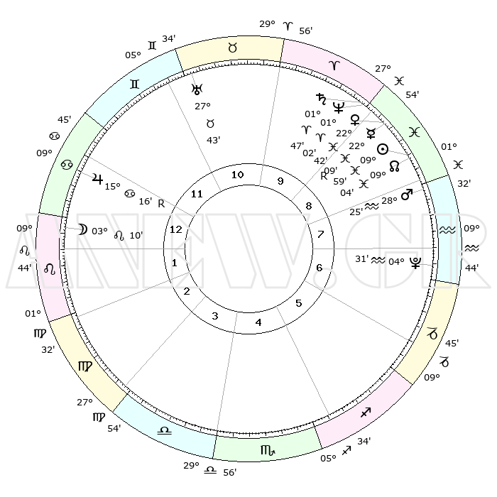 | | ΘΕΣΕΙΣ ΠΛΑΝΗΤΩΝ ΑΣΤΡΟΛΟΓΙΚΟΥ ΧΑΡΤΗ ΤΗΣ ΣΤΙΓΜΗΣ ΑΥΤΗΣ | | | | Πλανήτης | Ζώδιο | Μοίρες | Δεκαήμ. | Σε οίκο | Απόκλιση | | Ακμές των οίκων | | Ηλιος | Ιχθείς | 09°55' | Πρώτο | 9 | 07 S 51 | | 1ος | 21°50' | Καρκίνος | | Σελήνη | Λέων | 02°18' | Πρώτο | 1 | 22 N 43 | | 2ος | 12°26' | Λέων | | Ερμής | Ιχθείς | 22°10'R | Τρίτο | 9 | 00 S 09 | | 3ος | 06°25' | Παρθένος | | Αφροδίτη | Ιχθείς | 22°37' | Τρίτο | 9 | 04 S 11 | | 4ος | 06°19' | Ζυγός | | Αρης | Υδροχόος | 28°22' | Τρίτο | 8 | 13 S 04 | | 5ος | 12°21' | Σκορπιός | | Δίας | Καρκίνος | 15°16'R | Δεύτερο | 12 | 22 N 54 | | 6ος | 19°26' | Τοξότης | | Κρόνος | Κριός | 01°47' | Πρώτο | 9 | 01 S 15 | | 7ος | 21°50' | Αιγόκερως | | Ουρανός | Ταύρος | 27°43' | Τρίτο | 11 | 19 N 28 | | 8ος | 12°26' | Υδροχόος | | Ποσειδώνας | Κριός | 01°02' | Πρώτο | 9 | 00 S 47 | | 9ος | 06°25' | Ιχθείς | | Πλούτωνας | Υδροχόος | 04°31' | Πρώτο | 7 | 22 S 53 | | 10ος | 06°19' | Κριός | | Β. Δεσμός | Ιχθείς | 09°04' | Πρώτο | 9 | 08 S 10 | | 11ος | 12°21' | Ταύρος | | Ωροσκόπος | Καρκίνος | 21°50' | Τρίτο | | | 12ος | 19°26' | Δίδυμοι | | Μεσουράνημα | Κριός | 06°19' | Πρώτο | | | |