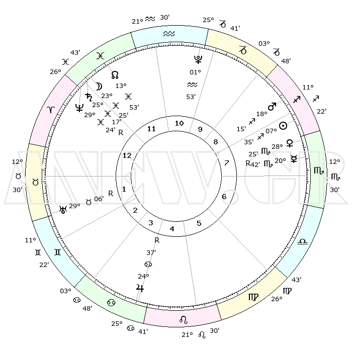 | | ΘΕΣΕΙΣ ΠΛΑΝΗΤΩΝ ΑΣΤΡΟΛΟΓΙΚΟΥ ΧΑΡΤΗ ΤΗΣ ΣΤΙΓΜΗΣ ΑΥΤΗΣ | | | | Πλανήτης | Ζώδιο | Μοίρες | Δεκαήμ. | Σε οίκο | Απόκλιση | | Ακμές των οίκων | | Ηλιος | Τοξότης | 07°34' | Πρώτο | 8 | 21 S 34 | | 1ος | 01°03' | Ταύρος | | Σελήνη | Ιχθείς | 23°07' | Τρίτο | 12 | 02 S 02 | | 2ος | 02°59' | Δίδυμοι | | Ερμής | Σκορπιός | 20°43'R | Τρίτο | 7 | 15 S 29 | | 3ος | 26°26' | Δίδυμοι | | Αφροδίτη | Σκορπιός | 28°23' | Τρίτο | 7 | 19 S 03 | | 4ος | 18°08' | Καρκίνος | | Αρης | Τοξότης | 18°14' | Δεύτερο | 8 | 23 S 34 | | 5ος | 12°38' | Λέων | | Δίας | Καρκίνος | 24°37'R | Τρίτο | 4 | 21 N 21 | | 6ος | 15°33' | Παρθένος | | Κρόνος | Ιχθείς | 25°17' | Τρίτο | 12 | 04 S 03 | | 7ος | 01°03' | Σκορπιός | | Ουρανός | Ταύρος | 29°06'R | Τρίτο | 1 | 19 N 45 | | 8ος | 02°59' | Τοξότης | | Ποσειδώνας | Ιχθείς | 29°24'R | Τρίτο | 12 | 01 S 29 | | 9ος | 26°26' | Τοξότης | | Πλούτωνας | Υδροχόος | 01°52' | Πρώτο | 10 | 23 S 24 | | 10ος | 18°08' | Αιγόκερως | | Β. Δεσμός | Ιχθείς | 13°53' | Δεύτερο | 11 | 06 S 20 | | 11ος | 12°38' | Υδροχόος | | Ωροσκόπος | Ταύρος | 01°03' | Πρώτο | | | 12ος | 15°33' | Ιχθείς | | Μεσουράνημα | Αιγόκερως | 18°08' | Δεύτερο | | | |