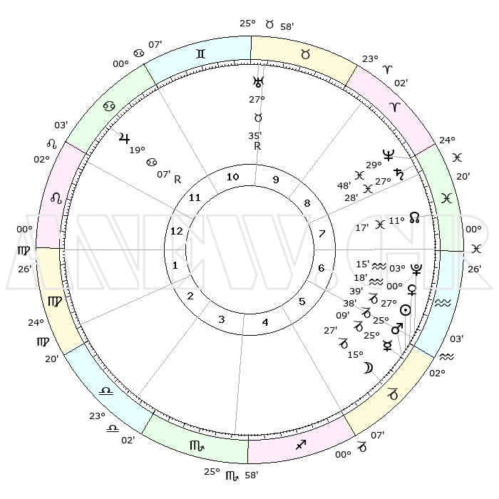 | | ΘΕΣΕΙΣ ΠΛΑΝΗΤΩΝ ΑΣΤΡΟΛΟΓΙΚΟΥ ΧΑΡΤΗ ΤΗΣ ΣΤΙΓΜΗΣ ΑΥΤΗΣ | | | | Πλανήτης | Ζώδιο | Μοίρες | Δεκαήμ. | Σε οίκο | Απόκλιση | | Ακμές των οίκων | | Ηλιος | Αιγόκερως | 27°35' | Τρίτο | 6 | 20 S 38 | | 1ος | 12°31' | Λέων | | Σελήνη | Αιγόκερως | 14°42' | Δεύτερο | 6 | 26 S 48 | | 2ος | 04°35' | Παρθένος | | Ερμής | Αιγόκερως | 25°03' | Τρίτο | 6 | 23 S 01 | | 3ος | 01°18' | Ζυγός | | Αφροδίτη | Υδροχόος | 00°13' | Πρώτο | 6 | 21 S 08 | | 4ος | 03°34' | Σκορπιός | | Αρης | Αιγόκερως | 25°35' | Τρίτο | 6 | 21 S 59 | | 5ος | 09°00' | Τοξότης | | Δίας | Καρκίνος | 19°07'R | Δεύτερο | 12 | 22 N 21 | | 6ος | 12°49' | Αιγόκερως | | Κρόνος | Ιχθείς | 27°28' | Τρίτο | 8 | 03 S 02 | | 7ος | 12°31' | Υδροχόος | | Ουρανός | Ταύρος | 27°35'R | Τρίτο | 10 | 19 N 26 | | 8ος | 04°35' | Ιχθείς | | Ποσειδώνας | Ιχθείς | 29°48' | Τρίτο | 8 | 01 S 18 | | 9ος | 01°18' | Κριός | | Πλούτωνας | Υδροχόος | 03°15' | Πρώτο | 6 | 23 S 07 | | 10ος | 03°34' | Ταύρος | | Β. Δεσμός | Ιχθείς | 11°17' | Δεύτερο | 8 | 07 S 20 | | 11ος | 09°00' | Δίδυμοι | | Ωροσκόπος | Λέων | 12°31' | Δεύτερο | | | 12ος | 12°49' | Καρκίνος | | Μεσουράνημα | Ταύρος | 03°34' | Πρώτο | | | |