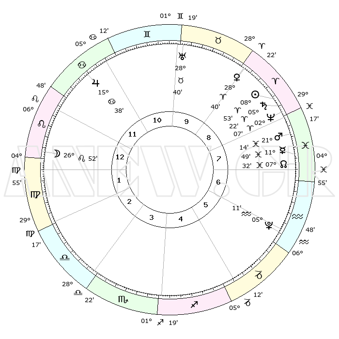 | | ΘΕΣΕΙΣ ΠΛΑΝΗΤΩΝ ΑΣΤΡΟΛΟΓΙΚΟΥ ΧΑΡΤΗ ΤΗΣ ΣΤΙΓΜΗΣ ΑΥΤΗΣ | | | | Πλανήτης | Ζώδιο | Μοίρες | Δεκαήμ. | Σε οίκο | Απόκλιση | | Ακμές των οίκων | | Ηλιος | Κριός | 08°50' | Πρώτο | 9 | 03 N 30 | | 1ος | 17°22' | Λέων | | Σελήνη | Λέων | 26°04' | Τρίτο | 1 | 13 N 55 | | 2ος | 09°54' | Παρθένος | | Ερμής | Ιχθείς | 11°47' | Δεύτερο | 8 | 07 S 58 | | 3ος | 07°14' | Ζυγός | | Αφροδίτη | Κριός | 28°36' | Τρίτο | 9 | 10 N 28 | | 4ος | 09°47' | Σκορπιός | | Αρης | Ιχθείς | 21°11' | Τρίτο | 8 | 04 S 28 | | 5ος | 14°54' | Τοξότης | | Δίας | Καρκίνος | 15°38' | Δεύτερο | 11 | 22 N 53 | | 6ος | 18°05' | Αιγόκερως | | Κρόνος | Κριός | 05°21' | Πρώτο | 8 | 00 N 10 | | 7ος | 17°22' | Υδροχόος | | Ουρανός | Ταύρος | 28°39' | Τρίτο | 10 | 19 N 41 | | 8ος | 09°54' | Ιχθείς | | Ποσειδώνας | Κριός | 02°07' | Πρώτο | 8 | 00 S 21 | | 9ος | 07°14' | Κριός | | Πλούτωνας | Υδροχόος | 05°11' | Πρώτο | 6 | 22 S 48 | | 10ος | 09°47' | Ταύρος | | Β. Δεσμός | Ιχθείς | 07°32' | Πρώτο | 7 | 08 S 44 | | 11ος | 14°54' | Δίδυμοι | | Ωροσκόπος | Λέων | 17°22' | Δεύτερο | | | 12ος | 18°05' | Καρκίνος | | Μεσουράνημα | Ταύρος | 09°47' | Πρώτο | | | |