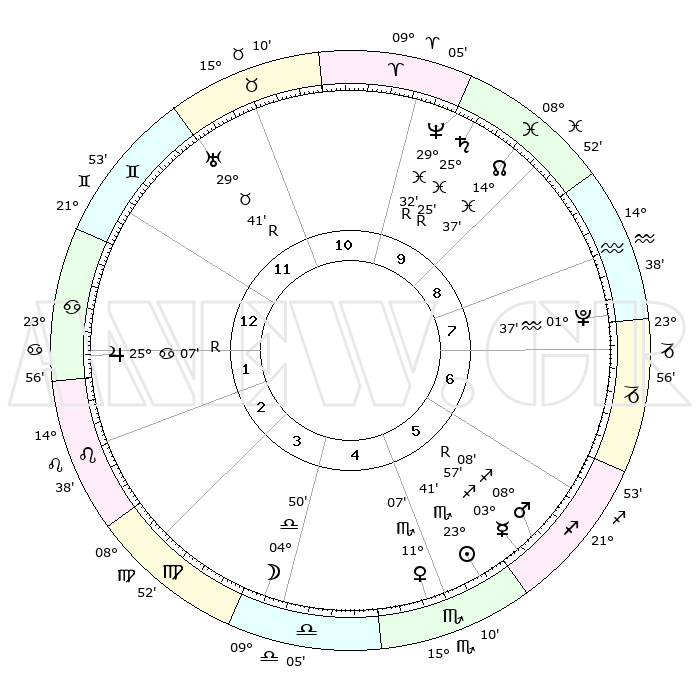 | | ΘΕΣΕΙΣ ΠΛΑΝΗΤΩΝ ΑΣΤΡΟΛΟΓΙΚΟΥ ΧΑΡΤΗ ΤΗΣ ΣΤΙΓΜΗΣ ΑΥΤΗΣ | | | | Πλανήτης | Ζώδιο | Μοίρες | Δεκαήμ. | Σε οίκο | Απόκλιση | | Ακμές των οίκων | | Ηλιος | Σκορπιός | 23°37' | Τρίτο | 5 | 18 S 40 | | 1ος | 01°50' | Καρκίνος | | Σελήνη | Ζυγός | 03°58' | Πρώτο | 4 | 03 S 00 | | 2ος | 22°31' | Καρκίνος | | Ερμής | Τοξότης | 04°01'R | Πρώτο | 6 | 21 S 56 | | 3ος | 14°27' | Λέων | | Αφροδίτη | Σκορπιός | 11°02' | Δεύτερο | 5 | 14 S 00 | | 4ος | 11°03' | Παρθένος | | Αρης | Τοξότης | 08°05' | Πρώτο | 6 | 22 S 10 | | 5ος | 15°17' | Ζυγός | | Δίας | Καρκίνος | 25°07'R | Τρίτο | 2 | 21 N 13 | | 6ος | 25°08' | Σκορπιός | | Κρόνος | Ιχθείς | 25°25'R | Τρίτο | 10 | 04 S 03 | | 7ος | 01°50' | Αιγόκερως | | Ουρανός | Ταύρος | 29°41'R | Τρίτο | 12 | 19 N 52 | | 8ος | 22°31' | Αιγόκερως | | Ποσειδώνας | Ιχθείς | 29°32'R | Τρίτο | 10 | 01 S 26 | | 9ος | 14°27' | Υδροχόος | | Πλούτωνας | Υδροχόος | 01°37' | Πρώτο | 8 | 23 S 28 | | 10ος | 11°03' | Ιχθείς | | Β. Δεσμός | Ιχθείς | 14°37' | Δεύτερο | 10 | 06 S 03 | | 11ος | 15°17' | Κριός | | Ωροσκόπος | Καρκίνος | 01°50' | Πρώτο | | | 12ος | 25°08' | Ταύρος | | Μεσουράνημα | Ιχθείς | 11°03' | Δεύτερο | | | |
