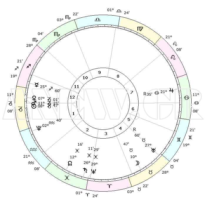 | | ΘΕΣΕΙΣ ΠΛΑΝΗΤΩΝ ΑΣΤΡΟΛΟΓΙΚΟΥ ΧΑΡΤΗ ΤΗΣ ΣΤΙΓΜΗΣ ΑΥΤΗΣ | | | | Πλανήτης | Ζώδιο | Μοίρες | Δεκαήμ. | Σε οίκο | Απόκλιση | | Ακμές των οίκων | | Ηλιος | Αιγόκερως | 08°42' | Πρώτο | 1 | 23 S 09 | | 1ος | 15°34' | Τοξότης | | Σελήνη | Ταύρος | 09°39' | Πρώτο | 5 | 18 N 48 | | 2ος | 19°22' | Αιγόκερως | | Ερμής | Τοξότης | 25°53' | Τρίτο | 1 | 23 S 44 | | 3ος | 27°40' | Υδροχόος | | Αφροδίτη | Αιγόκερως | 06°55' | Πρώτο | 1 | 23 S 41 | | 4ος | 03°20' | Κριός | | Αρης | Αιγόκερως | 11°18' | Δεύτερο | 1 | 23 S 50 | | 5ος | 02°03' | Ταύρος | | Δίας | Καρκίνος | 21°35'R | Τρίτο | 8 | 21 N 56 | | 6ος | 25°08' | Ταύρος | | Κρόνος | Ιχθείς | 26°11' | Τρίτο | 3 | 03 S 36 | | 7ος | 15°34' | Δίδυμοι | | Ουρανός | Ταύρος | 27°60'R | Τρίτο | 6 | 19 N 31 | | 8ος | 19°22' | Καρκίνος | | Ποσειδώνας | Ιχθείς | 29°29' | Τρίτο | 3 | 01 S 26 | | 9ος | 27°40' | Λέων | | Πλούτωνας | Υδροχόος | 02°40' | Πρώτο | 2 | 23 S 14 | | 10ος | 03°20' | Ζυγός | | Β. Δεσμός | Ιχθείς | 12°16' | Δεύτερο | 3 | 06 S 57 | | 11ος | 02°03' | Σκορπιός | | Ωροσκόπος | Τοξότης | 15°34' | Δεύτερο | | | 12ος | 25°08' | Σκορπιός | | Μεσουράνημα | Ζυγός | 03°20' | Πρώτο | | | |