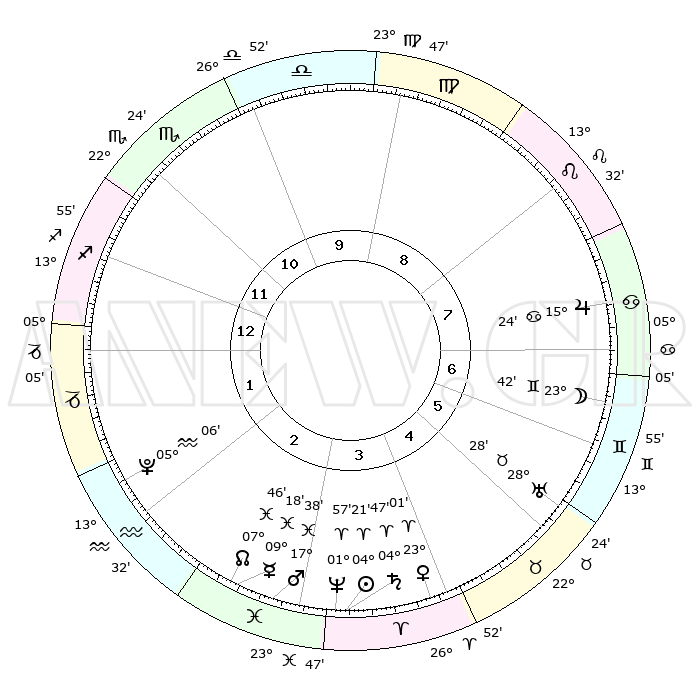 | | ΘΕΣΕΙΣ ΠΛΑΝΗΤΩΝ ΑΣΤΡΟΛΟΓΙΚΟΥ ΧΑΡΤΗ ΤΗΣ ΣΤΙΓΜΗΣ ΑΥΤΗΣ | | | | Πλανήτης | Ζώδιο | Μοίρες | Δεκαήμ. | Σε οίκο | Απόκλιση | | Ακμές των οίκων | | Ηλιος | Κριός | 04°17' | Πρώτο | 4 | 01 N 42 | | 1ος | 11°49' | Τοξότης | | Σελήνη | Δίδυμοι | 22°40' | Τρίτο | 7 | 28 N 18 | | 2ος | 14°53' | Αιγόκερως | | Ερμής | Ιχθείς | 09°17' | Πρώτο | 3 | 08 S 04 | | 3ος | 22°34' | Υδροχόος | | Αφροδίτη | Κριός | 22°55' | Τρίτο | 4 | 08 N 15 | | 4ος | 28°29' | Ιχθείς | | Αρης | Ιχθείς | 17°35' | Δεύτερο | 3 | 05 S 53 | | 5ος | 27°48' | Κριός | | Δίας | Καρκίνος | 15°24' | Δεύτερο | 8 | 22 N 54 | | 6ος | 21°20' | Ταύρος | | Κρόνος | Κριός | 04°47' | Πρώτο | 4 | 00 S 03 | | 7ος | 11°49' | Δίδυμοι | | Ουρανός | Ταύρος | 28°28' | Τρίτο | 6 | 19 N 39 | | 8ος | 14°53' | Καρκίνος | | Ποσειδώνας | Κριός | 01°57' | Πρώτο | 4 | 00 S 26 | | 9ος | 22°34' | Λέων | | Πλούτωνας | Υδροχόος | 05°06' | Πρώτο | 2 | 22 S 48 | | 10ος | 28°29' | Παρθένος | | Β. Δεσμός | Ιχθείς | 07°47' | Πρώτο | 3 | 08 S 39 | | 11ος | 27°48' | Ζυγός | | Ωροσκόπος | Τοξότης | 11°49' | Δεύτερο | | | 12ος | 21°20' | Σκορπιός | | Μεσουράνημα | Παρθένος | 28°29' | Τρίτο | | | |