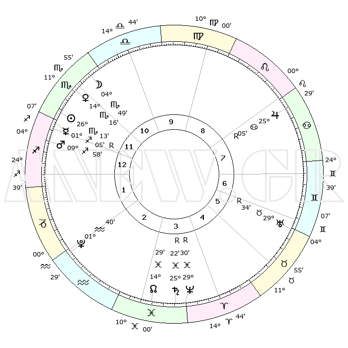 | | ΘΕΣΕΙΣ ΠΛΑΝΗΤΩΝ ΑΣΤΡΟΛΟΓΙΚΟΥ ΧΑΡΤΗ ΤΗΣ ΣΤΙΓΜΗΣ ΑΥΤΗΣ | | | | Πλανήτης | Ζώδιο | Μοίρες | Δεκαήμ. | Σε οίκο | Απόκλιση | | Ακμές των οίκων | | Ηλιος | Σκορπιός | 26°09' | Τρίτο | 12 | 19 S 17 | | 1ος | 05°31' | Τοξότης | | Σελήνη | Σκορπιός | 04°05' | Πρώτο | 11 | 16 S 24 | | 2ος | 07°29' | Αιγόκερως | | Ερμής | Τοξότης | 01°10'R | Πρώτο | 12 | 20 S 34 | | 3ος | 14°07' | Υδροχόος | | Αφροδίτη | Σκορπιός | 14°11' | Δεύτερο | 11 | 15 S 01 | | 4ος | 20°12' | Ιχθείς | | Αρης | Τοξότης | 09°55' | Πρώτο | 1 | 22 S 29 | | 5ος | 20°30' | Κριός | | Δίας | Καρκίνος | 25°05'R | Τρίτο | 8 | 21 N 14 | | 6ος | 14°48' | Ταύρος | | Κρόνος | Ιχθείς | 25°22'R | Τρίτο | 4 | 04 S 03 | | 7ος | 05°31' | Δίδυμοι | | Ουρανός | Ταύρος | 29°35'R | Τρίτο | 6 | 19 N 51 | | 8ος | 07°29' | Καρκίνος | | Ποσειδώνας | Ιχθείς | 29°31'R | Τρίτο | 4 | 01 S 27 | | 9ος | 14°07' | Λέων | | Πλούτωνας | Υδροχόος | 01°40' | Πρώτο | 2 | 23 S 27 | | 10ος | 20°12' | Παρθένος | | Β. Δεσμός | Ιχθείς | 14°29' | Δεύτερο | 3 | 06 S 06 | | 11ος | 20°30' | Ζυγός | | Ωροσκόπος | Τοξότης | 05°31' | Πρώτο | | | 12ος | 14°48' | Σκορπιός | | Μεσουράνημα | Παρθένος | 20°12' | Τρίτο | | | |