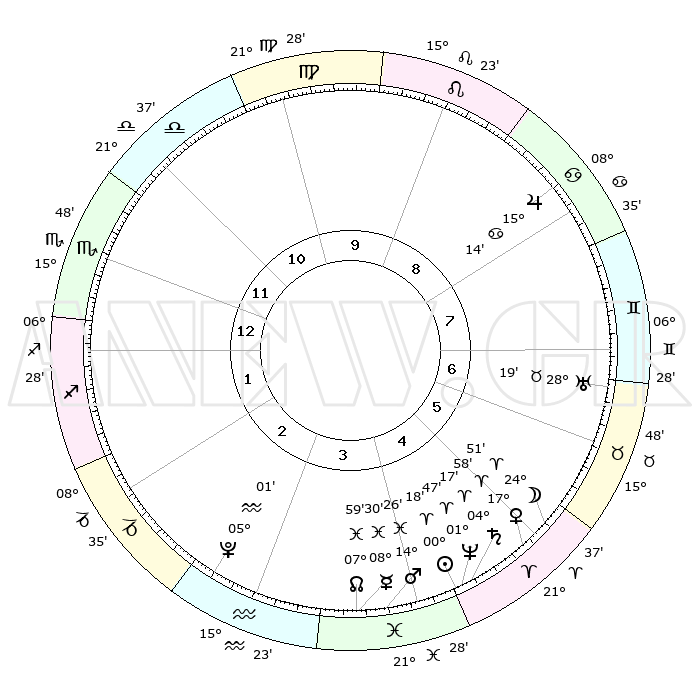 | | ΘΕΣΕΙΣ ΠΛΑΝΗΤΩΝ ΑΣΤΡΟΛΟΓΙΚΟΥ ΧΑΡΤΗ ΤΗΣ ΣΤΙΓΜΗΣ ΑΥΤΗΣ | | | | Πλανήτης | Ζώδιο | Μοίρες | Δεκαήμ. | Σε οίκο | Απόκλιση | | Ακμές των οίκων | | Ηλιος | Κριός | 00°14' | Πρώτο | 5 | 00 N 06 | | 1ος | 14°37' | Σκορπιός | | Σελήνη | Κριός | 23°46' | Τρίτο | 6 | 12 N 40 | | 2ος | 14°03' | Τοξότης | | Ερμής | Ιχθείς | 08°30'R | Πρώτο | 4 | 07 S 29 | | 3ος | 17°29' | Αιγόκερως | | Αφροδίτη | Κριός | 17°53' | Δεύτερο | 5 | 06 N 13 | | 4ος | 22°44' | Υδροχόος | | Αρης | Ιχθείς | 14°23' | Δεύτερο | 4 | 07 S 08 | | 5ος | 25°11' | Ιχθείς | | Δίας | Καρκίνος | 15°14' | Δεύτερο | 8 | 22 N 55 | | 6ος | 22°16' | Κριός | | Κρόνος | Κριός | 04°16' | Πρώτο | 5 | 00 S 15 | | 7ος | 14°37' | Ταύρος | | Ουρανός | Ταύρος | 28°19' | Τρίτο | 7 | 19 N 37 | | 8ος | 14°03' | Δίδυμοι | | Ποσειδώνας | Κριός | 01°47' | Πρώτο | 5 | 00 S 29 | | 9ος | 17°29' | Καρκίνος | | Πλούτωνας | Υδροχόος | 05°01' | Πρώτο | 3 | 22 S 49 | | 10ος | 22°44' | Λέων | | Β. Δεσμός | Ιχθείς | 07°60' | Πρώτο | 4 | 08 S 34 | | 11ος | 25°11' | Παρθένος | | Ωροσκόπος | Σκορπιός | 14°37' | Δεύτερο | | | 12ος | 22°16' | Ζυγός | | Μεσουράνημα | Λέων | 22°44' | Τρίτο | | | |