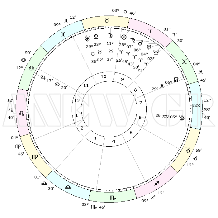 | | ΘΕΣΕΙΣ ΠΛΑΝΗΤΩΝ ΑΣΤΡΟΛΟΓΙΚΟΥ ΧΑΡΤΗ ΤΗΣ ΣΤΙΓΜΗΣ ΑΥΤΗΣ | | | | Πλανήτης | Ζώδιο | Μοίρες | Δεκαήμ. | Σε οίκο | Απόκλιση | | Ακμές των οίκων | | Ηλιος | Κριός | 28°21' | Τρίτο | 10 | 10 N 53 | | 1ος | 22°23' | Καρκίνος | | Σελήνη | Ταύρος | 10°35' | Δεύτερο | 10 | 19 N 18 | | 2ος | 13°01' | Λέων | | Ερμής | Κριός | 04°43' | Πρώτο | 9 | 00 S 33 | | 3ος | 07°03' | Παρθένος | | Αφροδίτη | Ταύρος | 22°57' | Τρίτο | 11 | 18 N 49 | | 4ος | 07°02' | Ζυγός | | Αρης | Κριός | 06°40' | Πρώτο | 9 | 01 N 45 | | 5ος | 13°06' | Σκορπιός | | Δίας | Καρκίνος | 17°20' | Δεύτερο | 12 | 22 N 41 | | 6ος | 20°05' | Τοξότης | | Κρόνος | Κριός | 07°47' | Πρώτο | 10 | 01 N 07 | | 7ος | 22°23' | Αιγόκερως | | Ουρανός | Ταύρος | 29°36' | Τρίτο | 11 | 19 N 54 | | 8ος | 13°01' | Υδροχόος | | Ποσειδώνας | Κριός | 02°51' | Πρώτο | 9 | 00 S 05 | | 9ος | 07°03' | Ιχθείς | | Πλούτωνας | Υδροχόος | 05°26' | Πρώτο | 7 | 22 S 47 | | 10ος | 07°02' | Κριός | | Β. Δεσμός | Ιχθείς | 06°29' | Πρώτο | 8 | 09 S 08 | | 11ος | 13°06' | Ταύρος | | Ωροσκόπος | Καρκίνος | 22°23' | Τρίτο | | | 12ος | 20°05' | Δίδυμοι | | Μεσουράνημα | Κριός | 07°02' | Πρώτο | | | |