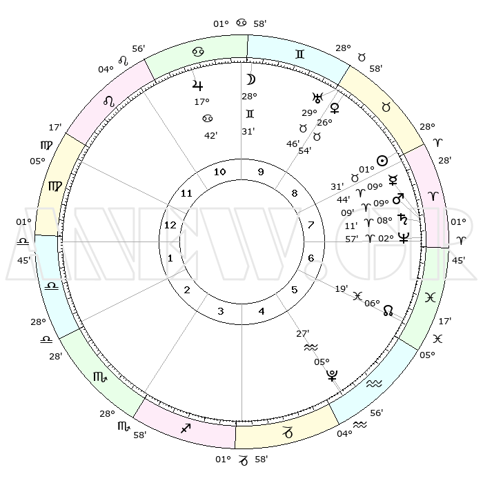 | | ΘΕΣΕΙΣ ΠΛΑΝΗΤΩΝ ΑΣΤΡΟΛΟΓΙΚΟΥ ΧΑΡΤΗ ΤΗΣ ΣΤΙΓΜΗΣ ΑΥΤΗΣ | | | | Πλανήτης | Ζώδιο | Μοίρες | Δεκαήμ. | Σε οίκο | Απόκλιση | | Ακμές των οίκων | | Ηλιος | Ταύρος | 01°27' | Πρώτο | 8 | 11 N 58 | | 1ος | 12°32' | Παρθένος | | Σελήνη | Δίδυμοι | 27°34' | Τρίτο | 10 | 28 N 12 | | 2ος | 07°39' | Ζυγός | | Ερμής | Κριός | 09°38' | Πρώτο | 8 | 01 N 26 | | 3ος | 07°15' | Σκορπιός | | Αφροδίτη | Ταύρος | 26°49' | Τρίτο | 9 | 19 N 54 | | 4ος | 10°12' | Τοξότης | | Αρης | Κριός | 09°06' | Πρώτο | 8 | 02 N 44 | | 5ος | 13°40' | Αιγόκερως | | Δίας | Καρκίνος | 17°42' | Δεύτερο | 11 | 22 N 39 | | 6ος | 14°50' | Υδροχόος | | Κρόνος | Κριός | 08°10' | Πρώτο | 8 | 01 N 16 | | 7ος | 12°31' | Ιχθείς | | Ουρανός | Ταύρος | 29°46' | Τρίτο | 9 | 19 N 56 | | 8ος | 07°39' | Κριός | | Ποσειδώνας | Κριός | 02°57' | Πρώτο | 7 | 00 S 02 | | 9ος | 07°15' | Ταύρος | | Πλούτωνας | Υδροχόος | 05°27' | Πρώτο | 5 | 22 S 48 | | 10ος | 10°12' | Δίδυμοι | | Β. Δεσμός | Ιχθείς | 06°19' | Πρώτο | 6 | 09 S 12 | | 11ος | 13°40' | Καρκίνος | | Ωροσκόπος | Παρθένος | 12°32' | Δεύτερο | | | 12ος | 14°50' | Λέων | | Μεσουράνημα | Δίδυμοι | 10°12' | Δεύτερο | | | |