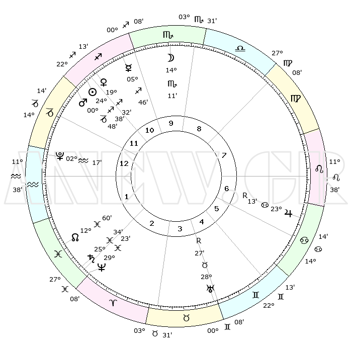 | | ΘΕΣΕΙΣ ΠΛΑΝΗΤΩΝ ΑΣΤΡΟΛΟΓΙΚΟΥ ΧΑΡΤΗ ΤΗΣ ΣΤΙΓΜΗΣ ΑΥΤΗΣ | | | | Πλανήτης | Ζώδιο | Μοίρες | Δεκαήμ. | Σε οίκο | Απόκλιση | | Ακμές των οίκων | | Ηλιος | Τοξότης | 24°04' | Τρίτο | 5 | 23 S 18 | | 1ος | 15°11' | Λέων | | Σελήνη | Σκορπιός | 07°31' | Πρώτο | 4 | 17 S 53 | | 2ος | 07°30' | Παρθένος | | Ερμής | Τοξότης | 05°00' | Πρώτο | 4 | 19 S 43 | | 3ος | 04°34' | Ζυγός | | Αφροδίτη | Τοξότης | 18°49' | Δεύτερο | 5 | 22 S 50 | | 4ος | 06°59' | Σκορπιός | | Αρης | Αιγόκερως | 00°22' | Πρώτο | 5 | 24 S 13 | | 5ος | 12°15' | Τοξότης | | Δίας | Καρκίνος | 23°17'R | Τρίτο | 12 | 21 N 37 | | 6ος | 15°43' | Αιγόκερως | | Κρόνος | Ιχθείς | 25°33' | Τρίτο | 8 | 03 S 53 | | 7ος | 15°11' | Υδροχόος | | Ουρανός | Ταύρος | 28°28'R | Τρίτο | 10 | 19 N 37 | | 8ος | 07°30' | Ιχθείς | | Ποσειδώνας | Ιχθείς | 29°23' | Τρίτο | 8 | 01 S 29 | | 9ος | 04°34' | Κριός | | Πλούτωνας | Υδροχόος | 02°16' | Πρώτο | 6 | 23 S 19 | | 10ος | 06°59' | Ταύρος | | Β. Δεσμός | Ιχθείς | 13°02' | Δεύτερο | 8 | 06 S 40 | | 11ος | 12°15' | Δίδυμοι | | Ωροσκόπος | Λέων | 15°11' | Δεύτερο | | | 12ος | 15°43' | Καρκίνος | | Μεσουράνημα | Ταύρος | 06°59' | Πρώτο | | | |