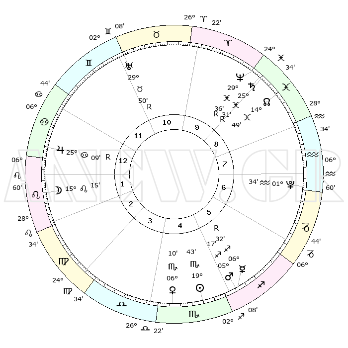 | | ΘΕΣΕΙΣ ΠΛΑΝΗΤΩΝ ΑΣΤΡΟΛΟΓΙΚΟΥ ΧΑΡΤΗ ΤΗΣ ΣΤΙΓΜΗΣ ΑΥΤΗΣ | | | | Πλανήτης | Ζώδιο | Μοίρες | Δεκαήμ. | Σε οίκο | Απόκλιση | | Ακμές των οίκων | | Ηλιος | Σκορπιός | 19°39' | Δεύτερο | 5 | 17 S 38 | | 1ος | 17°08' | Καρκίνος | | Σελήνη | Λέων | 14°22' | Δεύτερο | 2 | 19 N 05 | | 2ος | 07°36' | Λέων | | Ερμής | Τοξότης | 06°33'R | Πρώτο | 5 | 23 S 22 | | 3ος | 00°60' | Παρθένος | | Αφροδίτη | Σκορπιός | 06°05' | Πρώτο | 5 | 12 S 20 | | 4ος | 00°09' | Ζυγός | | Αρης | Τοξότης | 05°14' | Πρώτο | 5 | 21 S 39 | | 5ος | 06°00' | Σκορπιός | | Δίας | Καρκίνος | 25°09'R | Τρίτο | 1 | 21 N 12 | | 6ος | 13°52' | Τοξότης | | Κρόνος | Ιχθείς | 25°31'R | Τρίτο | 9 | 04 S 01 | | 7ος | 17°08' | Αιγόκερως | | Ουρανός | Ταύρος | 29°51'R | Τρίτο | 11 | 19 N 54 | | 8ος | 07°36' | Υδροχόος | | Ποσειδώνας | Ιχθείς | 29°36'R | Τρίτο | 9 | 01 S 25 | | 9ος | 00°60' | Ιχθείς | | Πλούτωνας | Υδροχόος | 01°34' | Πρώτο | 7 | 23 S 29 | | 10ος | 00°09' | Κριός | | Β. Δεσμός | Ιχθείς | 14°50' | Δεύτερο | 9 | 05 S 58 | | 11ος | 06°00' | Ταύρος | | Ωροσκόπος | Καρκίνος | 17°08' | Δεύτερο | | | 12ος | 13°52' | Δίδυμοι | | Μεσουράνημα | Κριός | 00°09' | Πρώτο | | | |