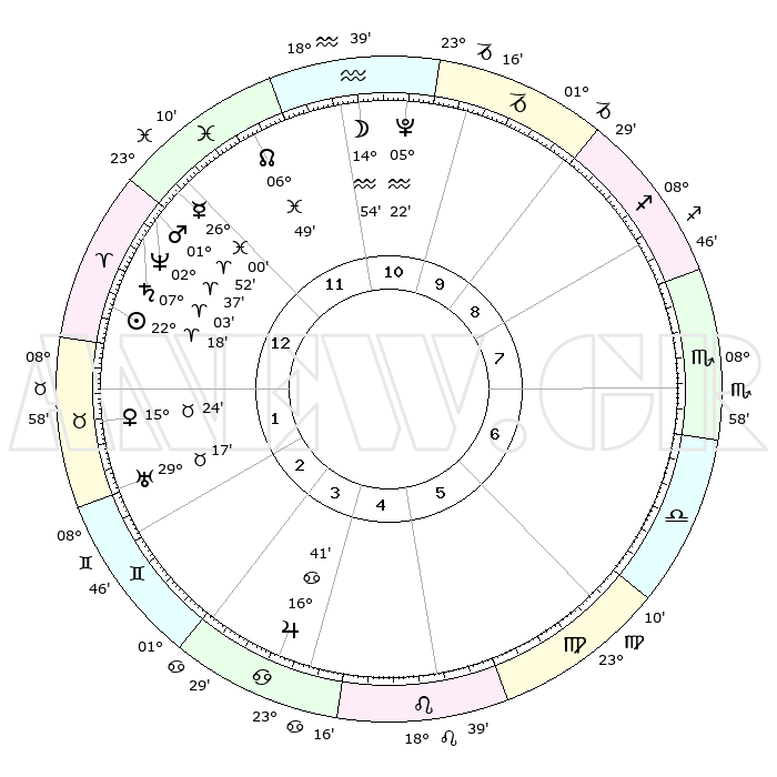 | | ΘΕΣΕΙΣ ΠΛΑΝΗΤΩΝ ΑΣΤΡΟΛΟΓΙΚΟΥ ΧΑΡΤΗ ΤΗΣ ΣΤΙΓΜΗΣ ΑΥΤΗΣ | | | | Πλανήτης | Ζώδιο | Μοίρες | Δεκαήμ. | Σε οίκο | Απόκλιση | | Ακμές των οίκων | | Ηλιος | Κριός | 22°14' | Τρίτο | 1 | 08 N 39 | | 1ος | 02°32' | Κριός | | Σελήνη | Υδροχόος | 14°05' | Δεύτερο | 11 | 18 S 37 | | 2ος | 12°12' | Ταύρος | | Ερμής | Ιχθείς | 25°55' | Τρίτο | 12 | 03 S 53 | | 3ος | 09°14' | Δίδυμοι | | Αφροδίτη | Ταύρος | 15°19' | Δεύτερο | 2 | 16 N 28 | | 4ος | 01°25' | Καρκίνος | | Αρης | Κριός | 01°49' | Πρώτο | 12 | 00 S 12 | | 5ος | 23°51' | Καρκίνος | | Δίας | Καρκίνος | 16°41' | Δεύτερο | 4 | 22 N 46 | | 6ος | 21°39' | Λέων | | Κρόνος | Κριός | 07°02' | Πρώτο | 1 | 00 N 50 | | 7ος | 02°32' | Ζυγός | | Ουρανός | Ταύρος | 29°17' | Τρίτο | 2 | 19 N 50 | | 8ος | 12°12' | Σκορπιός | | Ποσειδώνας | Κριός | 02°37' | Πρώτο | 1 | 00 S 10 | | 9ος | 09°14' | Τοξότης | | Πλούτωνας | Υδροχόος | 05°22' | Πρώτο | 11 | 22 S 47 | | 10ος | 01°25' | Αιγόκερως | | Β. Δεσμός | Ιχθείς | 06°49' | Πρώτο | 12 | 09 S 00 | | 11ος | 23°51' | Αιγόκερως | | Ωροσκόπος | Κριός | 02°32' | Πρώτο | | | 12ος | 21°39' | Υδροχόος | | Μεσουράνημα | Αιγόκερως | 01°25' | Πρώτο | | | |