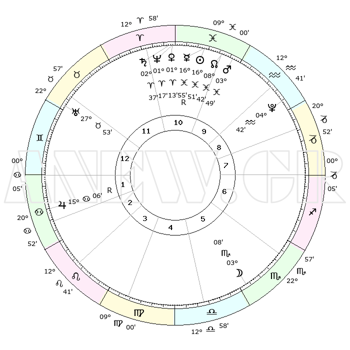 | | ΘΕΣΕΙΣ ΠΛΑΝΗΤΩΝ ΑΣΤΡΟΛΟΓΙΚΟΥ ΧΑΡΤΗ ΤΗΣ ΣΤΙΓΜΗΣ ΑΥΤΗΣ | | | | Πλανήτης | Ζώδιο | Μοίρες | Δεκαήμ. | Σε οίκο | Απόκλιση | | Ακμές των οίκων | | Ηλιος | Ιχθείς | 16°47' | Δεύτερο | 10 | 05 S 13 | | 1ος | 09°28' | Δίδυμοι | | Σελήνη | Σκορπιός | 02°25' | Πρώτο | 6 | 16 S 17 | | 2ος | 02°33' | Καρκίνος | | Ερμής | Ιχθείς | 16°59'R | Δεύτερο | 10 | 01 S 47 | | 3ος | 23°46' | Καρκίνος | | Αφροδίτη | Κριός | 01°09' | Πρώτο | 11 | 00 S 41 | | 4ος | 17°21' | Λέων | | Αρης | Ιχθείς | 03°46' | Πρώτο | 10 | 11 S 09 | | 5ος | 17°32' | Παρθένος | | Δίας | Καρκίνος | 15°06'R | Δεύτερο | 2 | 22 N 56 | | 6ος | 27°12' | Ζυγός | | Κρόνος | Κριός | 02°36' | Πρώτο | 11 | 00 S 55 | | 7ος | 09°28' | Τοξότης | | Ουρανός | Ταύρος | 27°53' | Τρίτο | 12 | 19 N 31 | | 8ος | 02°33' | Αιγόκερως | | Ποσειδώνας | Κριός | 01°17' | Πρώτο | 11 | 00 S 41 | | 9ος | 23°46' | Αιγόκερως | | Πλούτωνας | Υδροχόος | 04°42' | Πρώτο | 9 | 22 S 51 | | 10ος | 17°21' | Υδροχόος | | Β. Δεσμός | Ιχθείς | 08°42' | Πρώτο | 10 | 08 S 18 | | 11ος | 17°32' | Ιχθείς | | Ωροσκόπος | Δίδυμοι | 09°28' | Πρώτο | | | 12ος | 27°12' | Κριός | | Μεσουράνημα | Υδροχόος | 17°21' | Δεύτερο | | | |