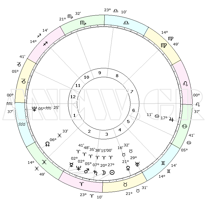 | | ΘΕΣΕΙΣ ΠΛΑΝΗΤΩΝ ΑΣΤΡΟΛΟΓΙΚΟΥ ΧΑΡΤΗ ΤΗΣ ΣΤΙΓΜΗΣ ΑΥΤΗΣ | | | | Πλανήτης | Ζώδιο | Μοίρες | Δεκαήμ. | Σε οίκο | Απόκλιση | | Ακμές των οίκων | | Ηλιος | Κριός | 26°57' | Τρίτο | 3 | 10 N 23 | | 1ος | 07°21' | Αιγόκερως | | Σελήνη | Κριός | 19°23' | Δεύτερο | 3 | 10 N 43 | | 2ος | 16°23' | Υδροχόος | | Ερμής | Κριός | 02°35' | Πρώτο | 3 | 01 S 23 | | 3ος | 26°41' | Ιχθείς | | Αφροδίτη | Ταύρος | 21°12' | Τρίτο | 4 | 18 N 18 | | 4ος | 29°21' | Κριός | | Αρης | Κριός | 05°33' | Πρώτο | 3 | 01 N 18 | | 5ος | 24°33' | Ταύρος | | Δίας | Καρκίνος | 17°10' | Δεύτερο | 7 | 22 N 43 | | 6ος | 15°59' | Δίδυμοι | | Κρόνος | Κριός | 07°37' | Πρώτο | 3 | 01 N 03 | | 7ος | 07°21' | Καρκίνος | | Ουρανός | Ταύρος | 29°31' | Τρίτο | 5 | 19 N 53 | | 8ος | 16°23' | Λέων | | Ποσειδώνας | Κριός | 02°48' | Πρώτο | 3 | 00 S 06 | | 9ος | 26°41' | Παρθένος | | Πλούτωνας | Υδροχόος | 05°25' | Πρώτο | 1 | 22 S 47 | | 10ος | 29°21' | Ζυγός | | Β. Δεσμός | Ιχθείς | 06°34' | Πρώτο | 2 | 09 S 06 | | 11ος | 24°33' | Σκορπιός | | Ωροσκόπος | Αιγόκερως | 07°21' | Πρώτο | | | 12ος | 15°59' | Τοξότης | | Μεσουράνημα | Ζυγός | 29°21' | Τρίτο | | | |