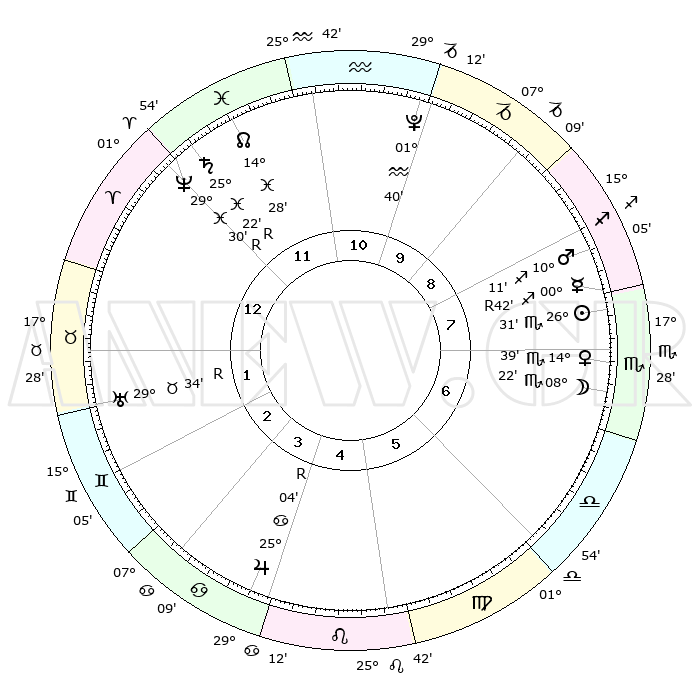 | | ΘΕΣΕΙΣ ΠΛΑΝΗΤΩΝ ΑΣΤΡΟΛΟΓΙΚΟΥ ΧΑΡΤΗ ΤΗΣ ΣΤΙΓΜΗΣ ΑΥΤΗΣ | | | | Πλανήτης | Ζώδιο | Μοίρες | Δεκαήμ. | Σε οίκο | Απόκλιση | | Ακμές των οίκων | | Ηλιος | Σκορπιός | 25°48' | Τρίτο | 4 | 19 S 12 | | 1ος | 25°13' | Λέων | | Σελήνη | Σκορπιός | 00°00' | Πρώτο | 3 | 14 S 45 | | 2ος | 18°34' | Παρθένος | | Ερμής | Τοξότης | 01°36'R | Πρώτο | 4 | 20 S 46 | | 3ος | 16°47' | Ζυγός | | Αφροδίτη | Σκορπιός | 13°45' | Δεύτερο | 3 | 14 S 53 | | 4ος | 19°37' | Σκορπιός | | Αρης | Τοξότης | 09°40' | Πρώτο | 4 | 22 S 26 | | 5ος | 24°08' | Τοξότης | | Δίας | Καρκίνος | 25°05'R | Τρίτο | 11 | 21 N 14 | | 6ος | 26°30' | Αιγόκερως | | Κρόνος | Ιχθείς | 25°23'R | Τρίτο | 8 | 04 S 03 | | 7ος | 25°13' | Υδροχόος | | Ουρανός | Ταύρος | 29°35'R | Τρίτο | 10 | 19 N 51 | | 8ος | 18°34' | Ιχθείς | | Ποσειδώνας | Ιχθείς | 29°31'R | Τρίτο | 8 | 01 S 27 | | 9ος | 16°46' | Κριός | | Πλούτωνας | Υδροχόος | 01°39' | Πρώτο | 6 | 23 S 28 | | 10ος | 19°37' | Ταύρος | | Β. Δεσμός | Ιχθείς | 14°30' | Δεύτερο | 7 | 06 S 06 | | 11ος | 24°08' | Δίδυμοι | | Ωροσκόπος | Λέων | 25°13' | Τρίτο | | | 12ος | 26°30' | Καρκίνος | | Μεσουράνημα | Ταύρος | 19°37' | Δεύτερο | | | |