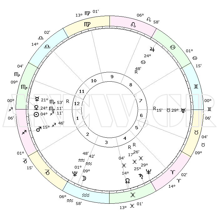 | | ΘΕΣΕΙΣ ΠΛΑΝΗΤΩΝ ΑΣΤΡΟΛΟΓΙΚΟΥ ΧΑΡΤΗ ΤΗΣ ΣΤΙΓΜΗΣ ΑΥΤΗΣ | | | | Πλανήτης | Ζώδιο | Μοίρες | Δεκαήμ. | Σε οίκο | Απόκλιση | | Ακμές των οίκων | | Ηλιος | Τοξότης | 04°11' | Πρώτο | 1 | 20 S 59 | | 1ος | 28°17' | Σκορπιός | | Σελήνη | Υδροχόος | 09°37' | Πρώτο | 3 | 20 S 36 | | 2ος | 29°10' | Τοξότης | | Ερμής | Σκορπιός | 21°53'R | Τρίτο | 12 | 16 S 11 | | 3ος | 04°36' | Υδροχόος | | Αφροδίτη | Σκορπιός | 24°11' | Τρίτο | 12 | 17 S 58 | | 4ος | 10°36' | Ιχθείς | | Αρης | Τοξότης | 15°45' | Δεύτερο | 1 | 23 S 17 | | 5ος | 11°50' | Κριός | | Δίας | Καρκίνος | 24°48'R | Τρίτο | 8 | 21 N 18 | | 6ος | 07°07' | Ταύρος | | Κρόνος | Ιχθείς | 25°17'R | Τρίτο | 4 | 04 S 04 | | 7ος | 28°16' | Ταύρος | | Ουρανός | Ταύρος | 29°15'R | Τρίτο | 7 | 19 N 47 | | 8ος | 29°10' | Δίδυμοι | | Ποσειδώνας | Ιχθείς | 29°26'R | Τρίτο | 4 | 01 S 28 | | 9ος | 04°36' | Λέων | | Πλούτωνας | Υδροχόος | 01°48' | Πρώτο | 2 | 23 S 25 | | 10ος | 10°36' | Παρθένος | | Β. Δεσμός | Ιχθείς | 14°04' | Δεύτερο | 4 | 06 S 16 | | 11ος | 11°50' | Ζυγός | | Ωροσκόπος | Σκορπιός | 28°17' | Τρίτο | | | 12ος | 07°07' | Σκορπιός | | Μεσουράνημα | Παρθένος | 10°36' | Δεύτερο | | | |