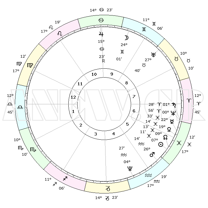 | | ΘΕΣΕΙΣ ΠΛΑΝΗΤΩΝ ΑΣΤΡΟΛΟΓΙΚΟΥ ΧΑΡΤΗ ΤΗΣ ΣΤΙΓΜΗΣ ΑΥΤΗΣ | | | | Πλανήτης | Ζώδιο | Μοίρες | Δεκαήμ. | Σε οίκο | Απόκλιση | | Ακμές των οίκων | | Ηλιος | Ιχθείς | 07°07' | Πρώτο | 6 | 08 S 54 | | 1ος | 23°18' | Παρθένος | | Σελήνη | Δίδυμοι | 23°05' | Τρίτο | 10 | 28 N 22 | | 2ος | 19°22' | Ζυγός | | Ερμής | Ιχθείς | 22°32' | Τρίτο | 6 | 00 S 31 | | 3ος | 19°32' | Σκορπιός | | Αφροδίτη | Ιχθείς | 19°09' | Δεύτερο | 6 | 05 S 35 | | 4ος | 22°28' | Τοξότης | | Αρης | Υδροχόος | 26°11' | Τρίτο | 5 | 13 S 49 | | 5ος | 25°34' | Αιγόκερως | | Δίας | Καρκίνος | 15°23'R | Δεύτερο | 10 | 22 N 53 | | 6ος | 26°15' | Υδροχόος | | Κρόνος | Κριός | 01°27' | Πρώτο | 7 | 01 S 23 | | 7ος | 23°18' | Ιχθείς | | Ουρανός | Ταύρος | 27°40' | Τρίτο | 9 | 19 N 27 | | 8ος | 19°22' | Κριός | | Ποσειδώνας | Κριός | 00°56' | Πρώτο | 7 | 00 S 50 | | 9ος | 19°32' | Ταύρος | | Πλούτωνας | Υδροχόος | 04°27' | Πρώτο | 5 | 22 S 53 | | 10ος | 22°28' | Δίδυμοι | | Β. Δεσμός | Ιχθείς | 09°13' | Πρώτο | 6 | 08 S 07 | | 11ος | 25°34' | Καρκίνος | | Ωροσκόπος | Παρθένος | 23°18' | Τρίτο | | | 12ος | 26°15' | Λέων | | Μεσουράνημα | Δίδυμοι | 22°28' | Τρίτο | | | |