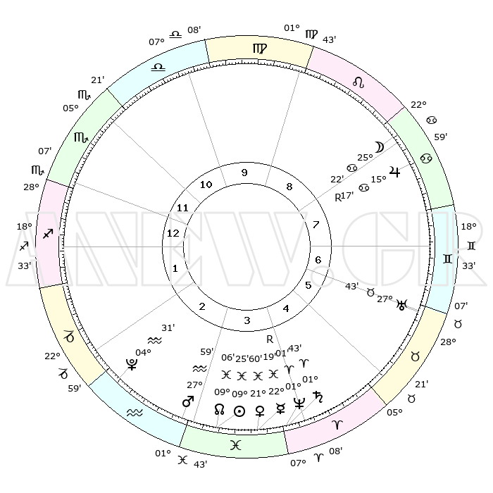 | | ΘΕΣΕΙΣ ΠΛΑΝΗΤΩΝ ΑΣΤΡΟΛΟΓΙΚΟΥ ΧΑΡΤΗ ΤΗΣ ΣΤΙΓΜΗΣ ΑΥΤΗΣ | | | | Πλανήτης | Ζώδιο | Μοίρες | Δεκαήμ. | Σε οίκο | Απόκλιση | | Ακμές των οίκων | | Ηλιος | Ιχθείς | 09°21' | Πρώτο | 3 | 08 S 04 | | 1ος | 28°48' | Σκορπιός | | Σελήνη | Καρκίνος | 24°26' | Τρίτο | 8 | 24 N 53 | | 2ος | 29°46' | Τοξότης | | Ερμής | Ιχθείς | 22°20'R | Τρίτο | 4 | 00 S 10 | | 3ος | 05°16' | Υδροχόος | | Αφροδίτη | Ιχθείς | 21°55' | Τρίτο | 4 | 04 S 28 | | 4ος | 11°17' | Ιχθείς | | Αρης | Υδροχόος | 27°56' | Τρίτο | 3 | 13 S 13 | | 5ος | 12°28' | Κριός | | Δίας | Καρκίνος | 15°17'R | Δεύτερο | 8 | 22 N 54 | | 6ος | 07°41' | Ταύρος | | Κρόνος | Κριός | 01°43' | Πρώτο | 4 | 01 S 17 | | 7ος | 28°48' | Ταύρος | | Ουρανός | Ταύρος | 27°43' | Τρίτο | 6 | 19 N 28 | | 8ος | 29°46' | Δίδυμοι | | Ποσειδώνας | Κριός | 01°01' | Πρώτο | 4 | 00 S 48 | | 9ος | 05°17' | Λέων | | Πλούτωνας | Υδροχόος | 04°30' | Πρώτο | 2 | 22 S 53 | | 10ος | 11°17' | Παρθένος | | Β. Δεσμός | Ιχθείς | 09°06' | Πρώτο | 3 | 08 S 09 | | 11ος | 12°28' | Ζυγός | | Ωροσκόπος | Σκορπιός | 28°48' | Τρίτο | | | 12ος | 07°41' | Σκορπιός | | Μεσουράνημα | Παρθένος | 11°17' | Δεύτερο | | | |