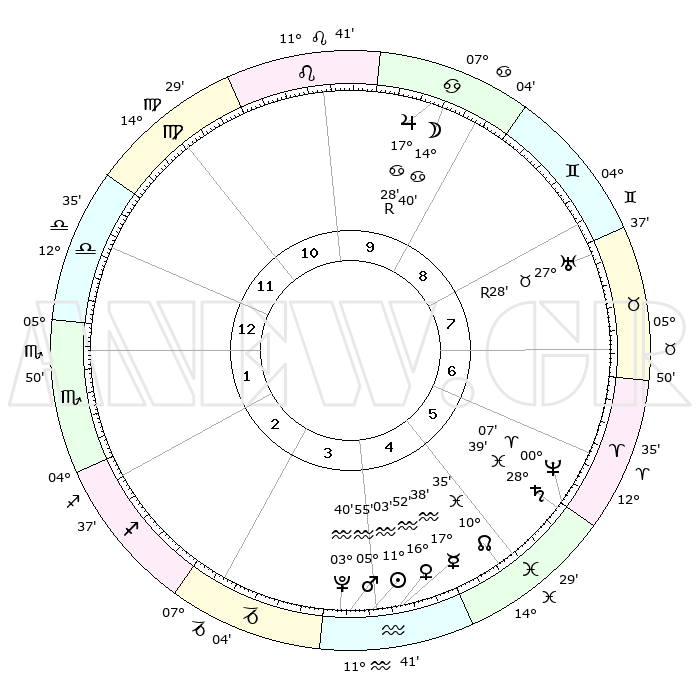 | | ΘΕΣΕΙΣ ΠΛΑΝΗΤΩΝ ΑΣΤΡΟΛΟΓΙΚΟΥ ΧΑΡΤΗ ΤΗΣ ΣΤΙΓΜΗΣ ΑΥΤΗΣ | | | | Πλανήτης | Ζώδιο | Μοίρες | Δεκαήμ. | Σε οίκο | Απόκλιση | | Ακμές των οίκων | | Ηλιος | Υδροχόος | 10°59' | Δεύτερο | 4 | 17 S 28 | | 1ος | 13°07' | Ζυγός | | Σελήνη | Καρκίνος | 13°33' | Δεύτερο | 9 | 27 N 02 | | 2ος | 10°33' | Σκορπιός | | Ερμής | Υδροχόος | 17°29' | Δεύτερο | 4 | 17 S 26 | | 3ος | 11°30' | Τοξότης | | Αφροδίτη | Υδροχόος | 16°46' | Δεύτερο | 4 | 17 S 05 | | 4ος | 14°48' | Αιγόκερως | | Αρης | Υδροχόος | 05°51' | Πρώτο | 4 | 19 S 49 | | 5ος | 17°44' | Υδροχόος | | Δίας | Καρκίνος | 17°29'R | Δεύτερο | 10 | 22 N 35 | | 6ος | 17°35' | Ιχθείς | | Κρόνος | Ιχθείς | 28°39' | Τρίτο | 6 | 02 S 32 | | 7ος | 13°07' | Κριός | | Ουρανός | Ταύρος | 27°28'R | Τρίτο | 8 | 19 N 24 | | 8ος | 10°33' | Ταύρος | | Ποσειδώνας | Κριός | 00°07' | Πρώτο | 6 | 01 S 10 | | 9ος | 11°30' | Δίδυμοι | | Πλούτωνας | Υδροχόος | 03°40' | Πρώτο | 4 | 23 S 02 | | 10ος | 14°48' | Καρκίνος | | Β. Δεσμός | Ιχθείς | 10°35' | Δεύτερο | 5 | 07 S 36 | | 11ος | 17°44' | Λέων | | Ωροσκόπος | Ζυγός | 13°07' | Δεύτερο | | | 12ος | 17°35' | Παρθένος | | Μεσουράνημα | Καρκίνος | 14°48' | Δεύτερο | | | |