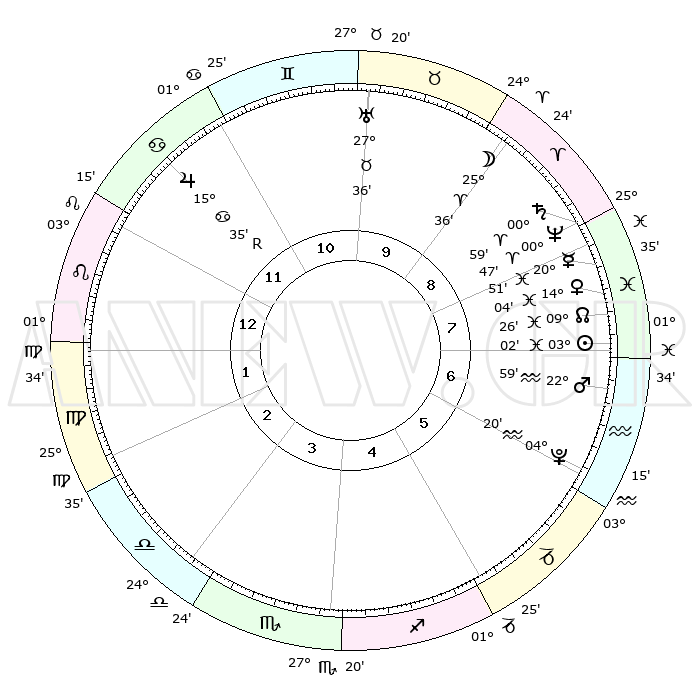 | | ΘΕΣΕΙΣ ΠΛΑΝΗΤΩΝ ΑΣΤΡΟΛΟΓΙΚΟΥ ΧΑΡΤΗ ΤΗΣ ΣΤΙΓΜΗΣ ΑΥΤΗΣ | | | | Πλανήτης | Ζώδιο | Μοίρες | Δεκαήμ. | Σε οίκο | Απόκλιση | | Ακμές των οίκων | | Ηλιος | Ιχθείς | 02°58' | Πρώτο | 7 | 10 S 25 | | 1ος | 11°50' | Λέων | | Σελήνη | Κριός | 24°39' | Τρίτο | 9 | 13 N 04 | | 2ος | 03°50' | Παρθένος | | Ερμής | Ιχθείς | 20°48' | Τρίτο | 8 | 02 S 07 | | 3ος | 00°28' | Ζυγός | | Αφροδίτη | Ιχθείς | 13°59' | Δεύτερο | 8 | 07 S 38 | | 4ος | 02°41' | Σκορπιός | | Αρης | Υδροχόος | 22°55' | Τρίτο | 7 | 14 S 54 | | 5ος | 08°10' | Τοξότης | | Δίας | Καρκίνος | 15°35'R | Δεύτερο | 12 | 22 N 51 | | 6ος | 12°04' | Αιγόκερως | | Κρόνος | Κριός | 00°58' | Πρώτο | 9 | 01 S 35 | | 7ος | 11°50' | Υδροχόος | | Ουρανός | Ταύρος | 27°36' | Τρίτο | 10 | 19 N 26 | | 8ος | 03°50' | Ιχθείς | | Ποσειδώνας | Κριός | 00°47' | Πρώτο | 9 | 00 S 53 | | 9ος | 00°28' | Κριός | | Πλούτωνας | Υδροχόος | 04°20' | Πρώτο | 6 | 22 S 54 | | 10ος | 02°41' | Ταύρος | | Β. Δεσμός | Ιχθείς | 09°26' | Πρώτο | 8 | 08 S 02 | | 11ος | 08°10' | Δίδυμοι | | Ωροσκόπος | Λέων | 11°50' | Δεύτερο | | | 12ος | 12°04' | Καρκίνος | | Μεσουράνημα | Ταύρος | 02°41' | Πρώτο | | | |