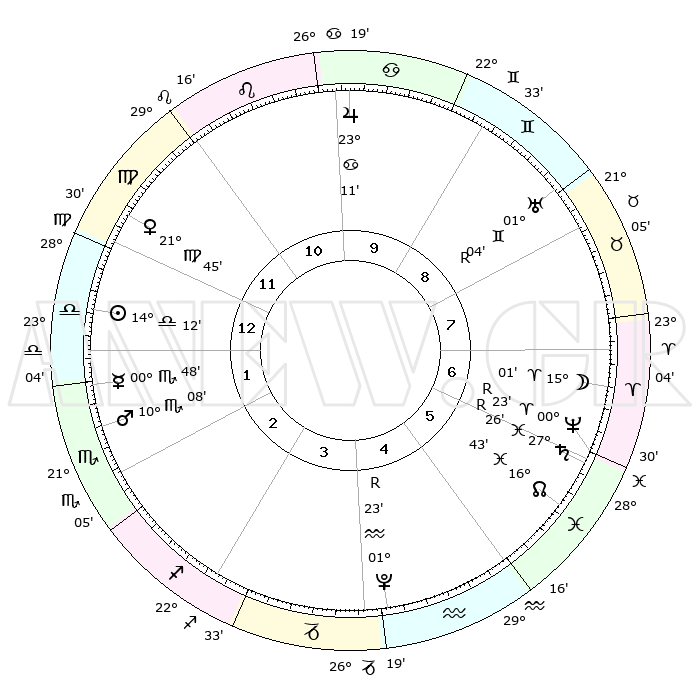 | ΘΕΣΕΙΣ ΠΛΑΝΗΤΩΝ ΑΣΤΡΟΛΟΓΙΚΟΥ ΧΑΡΤΗ ΤΗΣ ΣΤΙΓΜΗΣ ΑΥΤΗΣ | | Πλανήτης | Ζώδιο | Μοίρες | Δεκαήμ. | Σε οίκο | Απόκλιση | | Ακμές των οίκων | Ηλιος | Ζυγός | 14°06' | Δεύτερο | 1 | 05 S 34 | | 1ος | 23°51' | Παρθένος | Σελήνη | Κριός | 13°32' | Δεύτερο | 7 | 07 N 24 | | 2ος | 19°58' | Ζυγός | Ερμής | Σκορπιός | 00°39' | Πρώτο | 2 | 12 S 29 | | 3ος | 20°09' | Σκορπιός | Αφροδίτη | Παρθένος | 21°38' | Τρίτο | 12 | 04 N 37 | | 4ος | 23°05' | Τοξότης | Αρης | Σκορπιός | 10°04' | Δεύτερο | 2 | 14 S 58 | | 5ος | 26°10' | Αιγόκερως | Δίας | Καρκίνος | 23°10' | Τρίτο | 10 | 21 N 29 | | 6ος | 26°50' | Υδροχόος | Κρόνος | Ιχθείς | 27°26'R | Τρίτο | 7 | 03 S 19 | | 7ος | 23°51' | Ιχθείς | Ουρανός | Δίδυμοι | 01°04'R | Πρώτο | 9 | 20 N 10 | | 8ος | 19°58' | Κριός | Ποσειδώνας | Κριός | 00°23'R | Πρώτο | 7 | 01 S 07 | | 9ος | 20°09' | Ταύρος | Πλούτωνας | Υδροχόος | 01°23'R | Πρώτο | 5 | 23 S 32 | | 10ος | 23°05' | Δίδυμοι | Β. Δεσμός | Ιχθείς | 16°43' | Δεύτερο | 6 | 05 S 15 | | 11ος | 26°10' | Καρκίνος | Ωροσκόπος | Παρθένος | 23°51' | Τρίτο | | | 12ος | 26°50' | Λέων | Μεσουράνημα | Δίδυμοι | 23°05' | Τρίτο | | | |