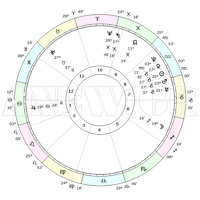 | | ΘΕΣΕΙΣ ΠΛΑΝΗΤΩΝ ΑΣΤΡΟΛΟΓΙΚΟΥ ΧΑΡΤΗ ΤΗΣ ΣΤΙΓΜΗΣ ΑΥΤΗΣ | | | | Πλανήτης | Ζώδιο | Μοίρες | Δεκαήμ. | Σε οίκο | Απόκλιση | | Ακμές των οίκων | | Ηλιος | Αιγόκερως | 25°23' | Τρίτο | 8 | 21 S 03 | | 1ος | 19°42' | Δίδυμοι | | Σελήνη | Τοξότης | 18°26' | Δεύτερο | 6 | 27 S 59 | | 2ος | 11°23' | Καρκίνος | | Ερμής | Αιγόκερως | 21°30' | Τρίτο | 8 | 23 S 30 | | 3ος | 02°42' | Λέων | | Αφροδίτη | Αιγόκερως | 27°30' | Τρίτο | 8 | 21 S 38 | | 4ος | 27°30' | Λέων | | Αρης | Αιγόκερως | 23°54' | Τρίτο | 8 | 22 S 17 | | 5ος | 29°38' | Παρθένος | | Δίας | Καρκίνος | 19°24'R | Δεύτερο | 2 | 22 N 18 | | 6ος | 09°55' | Σκορπιός | | Κρόνος | Ιχθείς | 27°17' | Τρίτο | 10 | 03 S 07 | | 7ος | 19°42' | Τοξότης | | Ουρανός | Ταύρος | 27°37'R | Τρίτο | 12 | 19 N 26 | | 8ος | 11°23' | Αιγόκερως | | Ποσειδώνας | Ιχθείς | 29°45' | Τρίτο | 11 | 01 S 19 | | 9ος | 02°42' | Υδροχόος | | Πλούτωνας | Υδροχόος | 03°11' | Πρώτο | 9 | 23 S 08 | | 10ος | 27°30' | Υδροχόος | | Β. Δεσμός | Ιχθείς | 11°24' | Δεύτερο | 10 | 07 S 17 | | 11ος | 29°38' | Ιχθείς | | Ωροσκόπος | Δίδυμοι | 19°42' | Δεύτερο | | | 12ος | 09°55' | Ταύρος | | Μεσουράνημα | Υδροχόος | 27°30' | Τρίτο | | | |