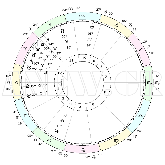 | | ΘΕΣΕΙΣ ΠΛΑΝΗΤΩΝ ΑΣΤΡΟΛΟΓΙΚΟΥ ΧΑΡΤΗ ΤΗΣ ΣΤΙΓΜΗΣ ΑΥΤΗΣ | | | | Πλανήτης | Ζώδιο | Μοίρες | Δεκαήμ. | Σε οίκο | Απόκλιση | | Ακμές των οίκων | | Ηλιος | Κριός | 25°11' | Τρίτο | 1 | 09 N 45 | | 1ος | 12°38' | Κριός | | Σελήνη | Ιχθείς | 23°47' | Τρίτο | 12 | 01 S 11 | | 2ος | 19°40' | Ταύρος | | Ερμής | Κριός | 00°01'R | Πρώτο | 12 | 02 S 23 | | 3ος | 15°16' | Δίδυμοι | | Αφροδίτη | Ταύρος | 19°00' | Δεύτερο | 1 | 17 N 38 | | 4ος | 07°08' | Καρκίνος | | Αρης | Κριός | 04°09' | Πρώτο | 12 | 00 N 45 | | 5ος | 00°07' | Λέων | | Δίας | Καρκίνος | 16°59' | Δεύτερο | 4 | 22 N 44 | | 6ος | 29°36' | Λέων | | Κρόνος | Κριός | 07°24' | Πρώτο | 12 | 00 N 58 | | 7ος | 12°38' | Ζυγός | | Ουρανός | Ταύρος | 29°26' | Τρίτο | 2 | 19 N 52 | | 8ος | 19°40' | Σκορπιός | | Ποσειδώνας | Κριός | 02°44' | Πρώτο | 12 | 00 S 07 | | 9ος | 15°16' | Τοξότης | | Πλούτωνας | Υδροχόος | 05°24' | Πρώτο | 11 | 22 S 47 | | 10ος | 07°08' | Αιγόκερως | | Β. Δεσμός | Ιχθείς | 06°39' | Πρώτο | 12 | 09 S 04 | | 11ος | 00°07' | Υδροχόος | | Ωροσκόπος | Κριός | 12°38' | Δεύτερο | | | 12ος | 29°36' | Υδροχόος | | Μεσουράνημα | Αιγόκερως | 07°08' | Πρώτο | | | |