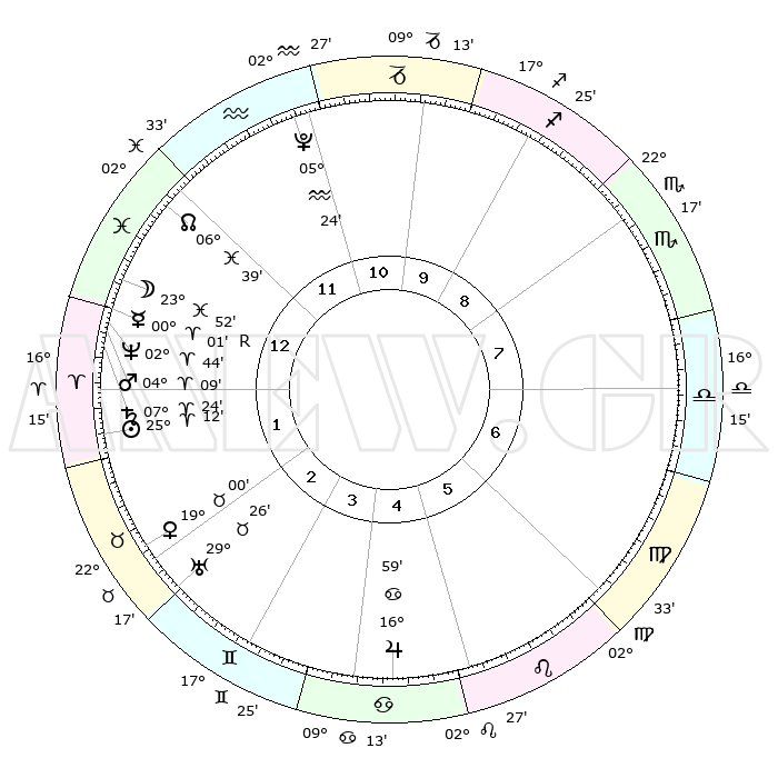 | | ΘΕΣΕΙΣ ΠΛΑΝΗΤΩΝ ΑΣΤΡΟΛΟΓΙΚΟΥ ΧΑΡΤΗ ΤΗΣ ΣΤΙΓΜΗΣ ΑΥΤΗΣ | | | | Πλανήτης | Ζώδιο | Μοίρες | Δεκαήμ. | Σε οίκο | Απόκλιση | | Ακμές των οίκων | | Ηλιος | Κριός | 25°08' | Τρίτο | 2 | 09 N 43 | | 1ος | 07°50' | Ιχθείς | | Σελήνη | Ιχθείς | 22°58' | Τρίτο | 1 | 01 S 35 | | 2ος | 22°25' | Κριός | | Ερμής | Ιχθείς | 29°56' | Τρίτο | 1 | 02 S 24 | | 3ος | 23°37' | Ταύρος | | Αφροδίτη | Ταύρος | 18°56' | Δεύτερο | 2 | 17 N 37 | | 4ος | 17°19' | Δίδυμοι | | Αρης | Κριός | 04°06' | Πρώτο | 1 | 00 N 44 | | 5ος | 09°01' | Καρκίνος | | Δίας | Καρκίνος | 16°58' | Δεύτερο | 5 | 22 N 44 | | 6ος | 03°26' | Λέων | | Κρόνος | Κριός | 07°24' | Πρώτο | 1 | 00 N 58 | | 7ος | 07°50' | Παρθένος | | Ουρανός | Ταύρος | 29°26' | Τρίτο | 3 | 19 N 52 | | 8ος | 22°25' | Ζυγός | | Ποσειδώνας | Κριός | 02°44' | Πρώτο | 1 | 00 S 07 | | 9ος | 23°37' | Σκορπιός | | Πλούτωνας | Υδροχόος | 05°24' | Πρώτο | 12 | 22 S 47 | | 10ος | 17°19' | Τοξότης | | Β. Δεσμός | Ιχθείς | 06°39' | Πρώτο | 12 | 09 S 04 | | 11ος | 09°01' | Αιγόκερως | | Ωροσκόπος | Ιχθείς | 07°50' | Πρώτο | | | 12ος | 03°26' | Υδροχόος | | Μεσουράνημα | Τοξότης | 17°19' | Δεύτερο | | | |