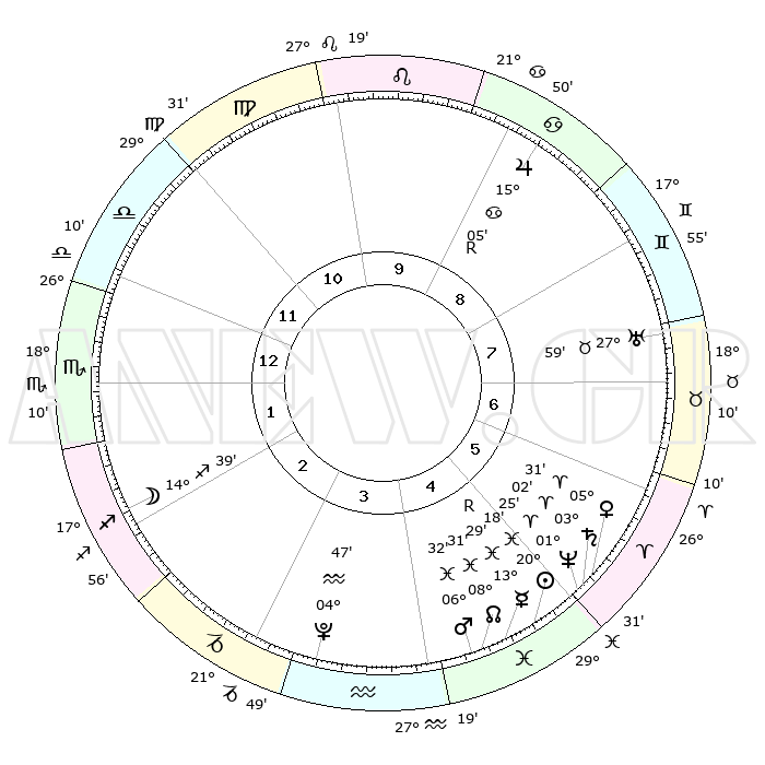 | | ΘΕΣΕΙΣ ΠΛΑΝΗΤΩΝ ΑΣΤΡΟΛΟΓΙΚΟΥ ΧΑΡΤΗ ΤΗΣ ΣΤΙΓΜΗΣ ΑΥΤΗΣ | | | | Πλανήτης | Ζώδιο | Μοίρες | Δεκαήμ. | Σε οίκο | Απόκλιση | | Ακμές των οίκων | | Ηλιος | Ιχθείς | 20°15' | Τρίτο | 5 | 03 S 52 | | 1ος | 29°26' | Ζυγός | | Σελήνη | Τοξότης | 13°53' | Δεύτερο | 2 | 27 S 41 | | 2ος | 27°49' | Σκορπιός | | Ερμής | Ιχθείς | 13°32'R | Δεύτερο | 5 | 03 S 27 | | 3ος | 29°44' | Τοξότης | | Αφροδίτη | Κριός | 05°26' | Πρώτο | 5 | 01 N 06 | | 4ος | 03°53' | Υδροχόος | | Αρης | Ιχθείς | 06°29' | Πρώτο | 4 | 10 S 09 | | 5ος | 06°48' | Ιχθείς | | Δίας | Καρκίνος | 15°05'R | Δεύτερο | 9 | 22 N 56 | | 6ος | 05°32' | Κριός | | Κρόνος | Κριός | 03°02' | Πρώτο | 5 | 00 S 45 | | 7ος | 29°26' | Κριός | | Ουρανός | Ταύρος | 27°59' | Τρίτο | 8 | 19 N 32 | | 8ος | 27°49' | Ταύρος | | Ποσειδώνας | Κριός | 01°25' | Πρώτο | 5 | 00 S 38 | | 9ος | 29°44' | Δίδυμοι | | Πλούτωνας | Υδροχόος | 04°47' | Πρώτο | 4 | 22 S 50 | | 10ος | 03°53' | Λέων | | Β. Δεσμός | Ιχθείς | 08°31' | Πρώτο | 5 | 08 S 22 | | 11ος | 06°48' | Παρθένος | | Ωροσκόπος | Ζυγός | 29°26' | Τρίτο | | | 12ος | 05°32' | Ζυγός | | Μεσουράνημα | Λέων | 03°53' | Πρώτο | | | |