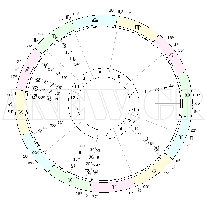 | | ΘΕΣΕΙΣ ΠΛΑΝΗΤΩΝ ΑΣΤΡΟΛΟΓΙΚΟΥ ΧΑΡΤΗ ΤΗΣ ΣΤΙΓΜΗΣ ΑΥΤΗΣ | | | | Πλανήτης | Ζώδιο | Μοίρες | Δεκαήμ. | Σε οίκο | Απόκλιση | | Ακμές των οίκων | | Ηλιος | Τοξότης | 24°08' | Τρίτο | 4 | 23 S 18 | | 1ος | 02°06' | Παρθένος | | Σελήνη | Σκορπιός | 08°13' | Πρώτο | 3 | 18 S 08 | | 2ος | 26°10' | Παρθένος | | Ερμής | Τοξότης | 05°05' | Πρώτο | 4 | 19 S 44 | | 3ος | 25°02' | Ζυγός | | Αφροδίτη | Τοξότης | 18°54' | Δεύτερο | 4 | 22 S 50 | | 4ος | 27°58' | Σκορπιός | | Αρης | Αιγόκερως | 00°25' | Πρώτο | 4 | 24 S 13 | | 5ος | 02°01' | Αιγόκερως | | Δίας | Καρκίνος | 23°17'R | Τρίτο | 11 | 21 N 37 | | 6ος | 03°49' | Υδροχόος | | Κρόνος | Ιχθείς | 25°34' | Τρίτο | 7 | 03 S 53 | | 7ος | 02°06' | Ιχθείς | | Ουρανός | Ταύρος | 28°28'R | Τρίτο | 10 | 19 N 37 | | 8ος | 26°10' | Ιχθείς | | Ποσειδώνας | Ιχθείς | 29°23' | Τρίτο | 8 | 01 S 29 | | 9ος | 25°02' | Κριός | | Πλούτωνας | Υδροχόος | 02°16' | Πρώτο | 5 | 23 S 19 | | 10ος | 27°58' | Ταύρος | | Β. Δεσμός | Ιχθείς | 13°01' | Δεύτερο | 7 | 06 S 40 | | 11ος | 02°01' | Καρκίνος | | Ωροσκόπος | Παρθένος | 02°06' | Πρώτο | | | 12ος | 03°49' | Λέων | | Μεσουράνημα | Ταύρος | 27°58' | Τρίτο | | | |