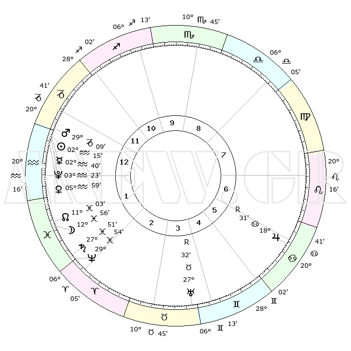| | ΘΕΣΕΙΣ ΠΛΑΝΗΤΩΝ ΑΣΤΡΟΛΟΓΙΚΟΥ ΧΑΡΤΗ ΤΗΣ ΣΤΙΓΜΗΣ ΑΥΤΗΣ | | | | Πλανήτης | Ζώδιο | Μοίρες | Δεκαήμ. | Σε οίκο | Απόκλιση | | Ακμές των οίκων | | Ηλιος | Υδροχόος | 02°11' | Πρώτο | 1 | 19 S 40 | | 1ος | 21°26' | Αιγόκερως | | Σελήνη | Ιχθείς | 12°05' | Δεύτερο | 2 | 06 S 48 | | 2ος | 03°53' | Ιχθείς | | Ερμής | Υδροχόος | 02°33' | Πρώτο | 1 | 21 S 36 | | 3ος | 13°28' | Κριός | | Αφροδίτη | Υδροχόος | 05°54' | Πρώτο | 1 | 19 S 56 | | 4ος | 13°29' | Ταύρος | | Αρης | Αιγόκερως | 29°06' | Τρίτο | 1 | 21 S 19 | | 5ος | 06°59' | Δίδυμοι | | Δίας | Καρκίνος | 18°32'R | Δεύτερο | 6 | 22 N 26 | | 6ος | 28°12' | Δίδυμοι | | Κρόνος | Ιχθείς | 27°51' | Τρίτο | 2 | 02 S 52 | | 7ος | 21°26' | Καρκίνος | | Ουρανός | Ταύρος | 27°32'R | Τρίτο | 4 | 19 N 25 | | 8ος | 03°53' | Παρθένος | | Ποσειδώνας | Ιχθείς | 29°54' | Τρίτο | 2 | 01 S 15 | | 9ος | 13°28' | Ζυγός | | Πλούτωνας | Υδροχόος | 03°23' | Πρώτο | 1 | 23 S 05 | | 10ος | 13°29' | Σκορπιός | | Β. Δεσμός | Ιχθείς | 11°03' | Δεύτερο | 2 | 07 S 25 | | 11ος | 06°59' | Τοξότης | | Ωροσκόπος | Αιγόκερως | 21°26' | Τρίτο | | | 12ος | 28°12' | Τοξότης | | Μεσουράνημα | Σκορπιός | 13°29' | Δεύτερο | | | |