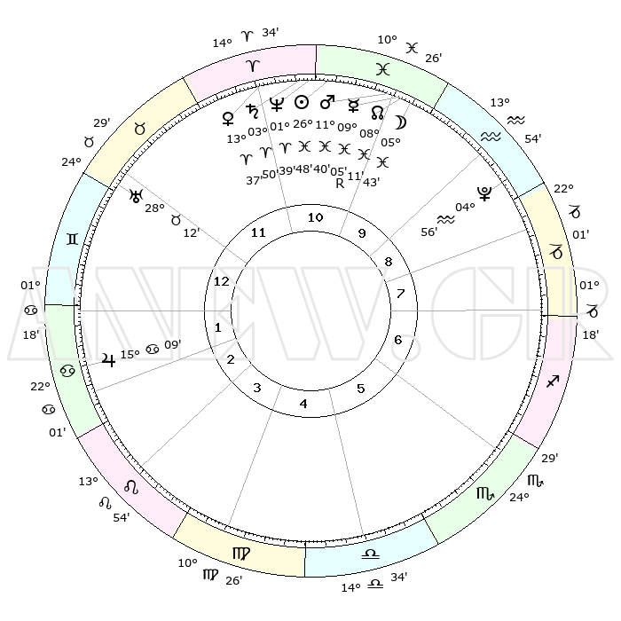 | | ΘΕΣΕΙΣ ΠΛΑΝΗΤΩΝ ΑΣΤΡΟΛΟΓΙΚΟΥ ΧΑΡΤΗ ΤΗΣ ΣΤΙΓΜΗΣ ΑΥΤΗΣ | | | | Πλανήτης | Ζώδιο | Μοίρες | Δεκαήμ. | Σε οίκο | Απόκλιση | | Ακμές των οίκων | | Ηλιος | Ιχθείς | 26°44' | Τρίτο | 11 | 01 S 18 | | 1ος | 01°41' | Δίδυμοι | | Σελήνη | Ιχθείς | 04°38' | Πρώτο | 10 | 10 S 11 | | 2ος | 26°09' | Δίδυμοι | | Ερμής | Ιχθείς | 09°07'R | Πρώτο | 10 | 06 S 26 | | 3ος | 17°31' | Καρκίνος | | Αφροδίτη | Κριός | 13°31' | Δεύτερο | 11 | 04 N 26 | | 4ος | 10°25' | Λέων | | Αρης | Ιχθείς | 11°36' | Δεύτερο | 11 | 08 S 13 | | 5ος | 09°10' | Παρθένος | | Δίας | Καρκίνος | 15°09' | Δεύτερο | 2 | 22 N 56 | | 6ος | 17°52' | Ζυγός | | Κρόνος | Κριός | 03°50' | Πρώτο | 11 | 00 S 26 | | 7ος | 01°41' | Τοξότης | | Ουρανός | Ταύρος | 28°11' | Τρίτο | 12 | 19 N 35 | | 8ος | 26°09' | Τοξότης | | Ποσειδώνας | Κριός | 01°39' | Πρώτο | 11 | 00 S 32 | | 9ος | 17°31' | Αιγόκερως | | Πλούτωνας | Υδροχόος | 04°56' | Πρώτο | 9 | 22 S 49 | | 10ος | 10°25' | Υδροχόος | | Β. Δεσμός | Ιχθείς | 08°11' | Πρώτο | 10 | 08 S 30 | | 11ος | 09°10' | Ιχθείς | | Ωροσκόπος | Δίδυμοι | 01°41' | Πρώτο | | | 12ος | 17°52' | Κριός | | Μεσουράνημα | Υδροχόος | 10°25' | Δεύτερο | | | |