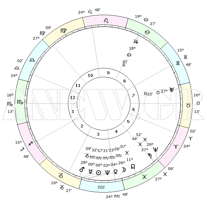 | | ΘΕΣΕΙΣ ΠΛΑΝΗΤΩΝ ΑΣΤΡΟΛΟΓΙΚΟΥ ΧΑΡΤΗ ΤΗΣ ΣΤΙΓΜΗΣ ΑΥΤΗΣ | | | | Πλανήτης | Ζώδιο | Μοίρες | Δεκαήμ. | Σε οίκο | Απόκλιση | | Ακμές των οίκων | | Ηλιος | Υδροχόος | 00°53' | Πρώτο | 4 | 19 S 57 | | 1ος | 25°15' | Ζυγός | | Σελήνη | Υδροχόος | 25°30' | Τρίτο | 4 | 14 S 11 | | 2ος | 23°24' | Σκορπιός | | Ερμής | Υδροχόος | 00°25' | Πρώτο | 4 | 22 S 03 | | 3ος | 25°00' | Τοξότης | | Αφροδίτη | Υδροχόος | 04°18' | Πρώτο | 4 | 20 S 17 | | 4ος | 28°53' | Αιγόκερως | | Αρης | Αιγόκερως | 28°06' | Τρίτο | 3 | 21 S 31 | | 5ος | 01°50' | Ιχθείς | | Δίας | Καρκίνος | 18°42'R | Δεύτερο | 9 | 22 N 25 | | 6ος | 00°55' | Κριός | | Κρόνος | Ιχθείς | 27°44' | Τρίτο | 5 | 02 S 55 | | 7ος | 25°15' | Κριός | | Ουρανός | Ταύρος | 27°33'R | Τρίτο | 8 | 19 N 25 | | 8ος | 23°24' | Ταύρος | | Ποσειδώνας | Ιχθείς | 29°52' | Τρίτο | 5 | 01 S 16 | | 9ος | 25°00' | Δίδυμοι | | Πλούτωνας | Υδροχόος | 03°21' | Πρώτο | 4 | 23 S 05 | | 10ος | 28°53' | Καρκίνος | | Β. Δεσμός | Ιχθείς | 11°07' | Δεύτερο | 5 | 07 S 24 | | 11ος | 01°50' | Παρθένος | | Ωροσκόπος | Ζυγός | 25°15' | Τρίτο | | | 12ος | 00°55' | Ζυγός | | Μεσουράνημα | Καρκίνος | 28°53' | Τρίτο | | | |