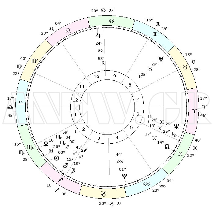 | | ΘΕΣΕΙΣ ΠΛΑΝΗΤΩΝ ΑΣΤΡΟΛΟΓΙΚΟΥ ΧΑΡΤΗ ΤΗΣ ΣΤΙΓΜΗΣ ΑΥΤΗΣ | | | | Πλανήτης | Ζώδιο | Μοίρες | Δεκαήμ. | Σε οίκο | Απόκλιση | | Ακμές των οίκων | | Ηλιος | Σκορπιός | 29°57' | Τρίτο | 3 | 20 S 08 | | 1ος | 01°36' | Ζυγός | | Σελήνη | Τοξότης | 18°50' | Δεύτερο | 3 | 27 S 56 | | 2ος | 28°19' | Ζυγός | | Ερμής | Σκορπιός | 26°08'R | Τρίτο | 2 | 18 S 14 | | 3ος | 28°48' | Σκορπιός | | Αφροδίτη | Σκορπιός | 18°55' | Δεύτερο | 2 | 16 S 29 | | 4ος | 01°48' | Αιγόκερως | | Αρης | Τοξότης | 12°41' | Δεύτερο | 3 | 22 S 54 | | 5ος | 04°46' | Υδροχόος | | Δίας | Καρκίνος | 24°58'R | Τρίτο | 10 | 21 N 16 | | 6ος | 05°08' | Ιχθείς | | Κρόνος | Ιχθείς | 25°19'R | Τρίτο | 6 | 04 S 04 | | 7ος | 01°36' | Κριός | | Ουρανός | Ταύρος | 29°25'R | Τρίτο | 9 | 19 N 49 | | 8ος | 28°19' | Κριός | | Ποσειδώνας | Ιχθείς | 29°28'R | Τρίτο | 6 | 01 S 27 | | 9ος | 28°48' | Ταύρος | | Πλούτωνας | Υδροχόος | 01°44' | Πρώτο | 4 | 23 S 27 | | 10ος | 01°48' | Καρκίνος | | Β. Δεσμός | Ιχθείς | 14°17' | Δεύτερο | 6 | 06 S 11 | | 11ος | 04°46' | Λέων | | Ωροσκόπος | Ζυγός | 01°36' | Πρώτο | | | 12ος | 05°08' | Παρθένος | | Μεσουράνημα | Καρκίνος | 01°48' | Πρώτο | | | |