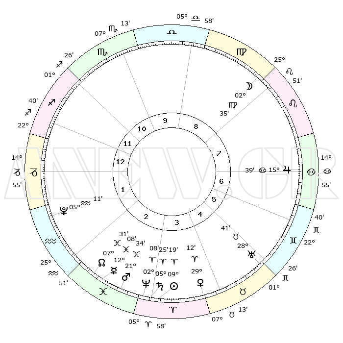 | | ΘΕΣΕΙΣ ΠΛΑΝΗΤΩΝ ΑΣΤΡΟΛΟΓΙΚΟΥ ΧΑΡΤΗ ΤΗΣ ΣΤΙΓΜΗΣ ΑΥΤΗΣ | | | | Πλανήτης | Ζώδιο | Μοίρες | Δεκαήμ. | Σε οίκο | Απόκλιση | | Ακμές των οίκων | | Ηλιος | Κριός | 09°14' | Πρώτο | 4 | 03 N 40 | | 1ος | 18°45' | Τοξότης | | Σελήνη | Παρθένος | 01°33' | Πρώτο | 8 | 11 N 32 | | 2ος | 23°14' | Αιγόκερως | | Ερμής | Ιχθείς | 12°05' | Δεύτερο | 3 | 07 S 55 | | 3ος | 01°60' | Ιχθείς | | Αφροδίτη | Κριός | 29°06' | Τρίτο | 4 | 10 N 40 | | 4ος | 07°24' | Κριός | | Αρης | Ιχθείς | 21°31' | Τρίτο | 3 | 04 S 20 | | 5ος | 05°35' | Ταύρος | | Δίας | Καρκίνος | 15°39' | Δεύτερο | 7 | 22 N 53 | | 6ος | 28°19' | Ταύρος | | Κρόνος | Κριός | 05°24' | Πρώτο | 3 | 00 N 12 | | 7ος | 18°45' | Δίδυμοι | | Ουρανός | Ταύρος | 28°40' | Τρίτο | 6 | 19 N 41 | | 8ος | 23°14' | Καρκίνος | | Ποσειδώνας | Κριός | 02°08' | Πρώτο | 3 | 00 S 21 | | 9ος | 01°60' | Παρθένος | | Πλούτωνας | Υδροχόος | 05°11' | Πρώτο | 2 | 22 S 48 | | 10ος | 07°24' | Ζυγός | | Β. Δεσμός | Ιχθείς | 07°31' | Πρώτο | 3 | 08 S 45 | | 11ος | 05°35' | Σκορπιός | | Ωροσκόπος | Τοξότης | 18°45' | Δεύτερο | | | 12ος | 28°19' | Σκορπιός | | Μεσουράνημα | Ζυγός | 07°24' | Πρώτο | | | |