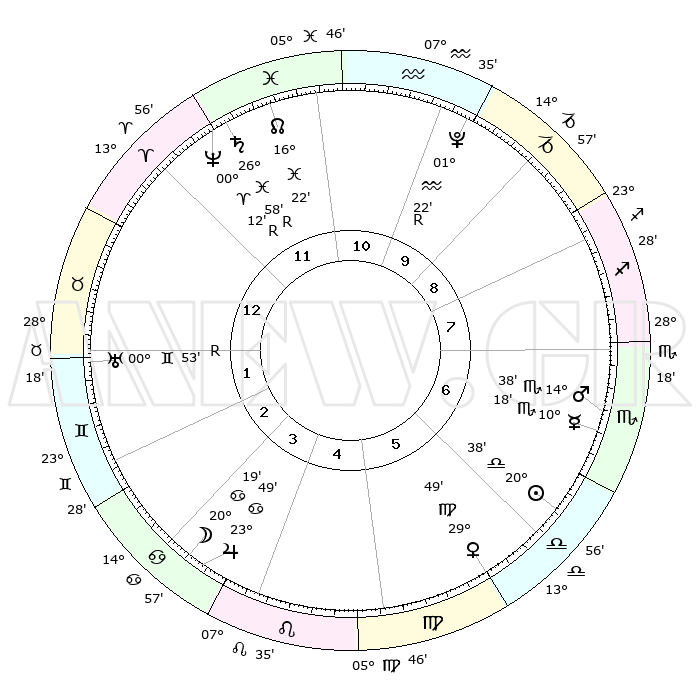 | ΘΕΣΕΙΣ ΠΛΑΝΗΤΩΝ ΑΣΤΡΟΛΟΓΙΚΟΥ ΧΑΡΤΗ ΤΗΣ ΣΤΙΓΜΗΣ ΑΥΤΗΣ | | Πλανήτης | Ζώδιο | Μοίρες | Δεκαήμ. | Σε οίκο | Απόκλιση | | Ακμές των οίκων | Ηλιος | Ζυγός | 20°33' | Τρίτο | 7 | 08 S 01 | | 1ος | 10°01' | Κριός | Σελήνη | Καρκίνος | 19°02' | Δεύτερο | 4 | 26 N 30 | | 2ος | 17°45' | Ταύρος | Ερμής | Σκορπιός | 10°10' | Δεύτερο | 7 | 16 S 22 | | 3ος | 13°42' | Δίδυμοι | Αφροδίτη | Παρθένος | 29°42' | Τρίτο | 6 | 01 N 30 | | 4ος | 05°39' | Καρκίνος | Αρης | Σκορπιός | 14°34' | Δεύτερο | 7 | 16 S 24 | | 5ος | 28°28' | Καρκίνος | Δίας | Καρκίνος | 23°49' | Τρίτο | 4 | 21 N 23 | | 6ος | 27°30' | Λέων | Κρόνος | Ιχθείς | 26°59'R | Τρίτο | 12 | 03 S 30 | | 7ος | 10°01' | Ζυγός | Ουρανός | Δίδυμοι | 00°54'R | Πρώτο | 2 | 20 N 08 | | 8ος | 17°45' | Σκορπιός | Ποσειδώνας | Κριός | 00°13'R | Πρώτο | 12 | 01 S 11 | | 9ος | 13°42' | Τοξότης | Πλούτωνας | Υδροχόος | 01°22'R | Πρώτο | 11 | 23 S 32 | | 10ος | 05°39' | Αιγόκερως | Β. Δεσμός | Ιχθείς | 16°22' | Δεύτερο | 12 | 05 S 23 | | 11ος | 28°28' | Αιγόκερως | Ωροσκόπος | Κριός | 10°01' | Δεύτερο | | | 12ος | 27°30' | Υδροχόος | Μεσουράνημα | Αιγόκερως | 05°39' | Πρώτο | | | |