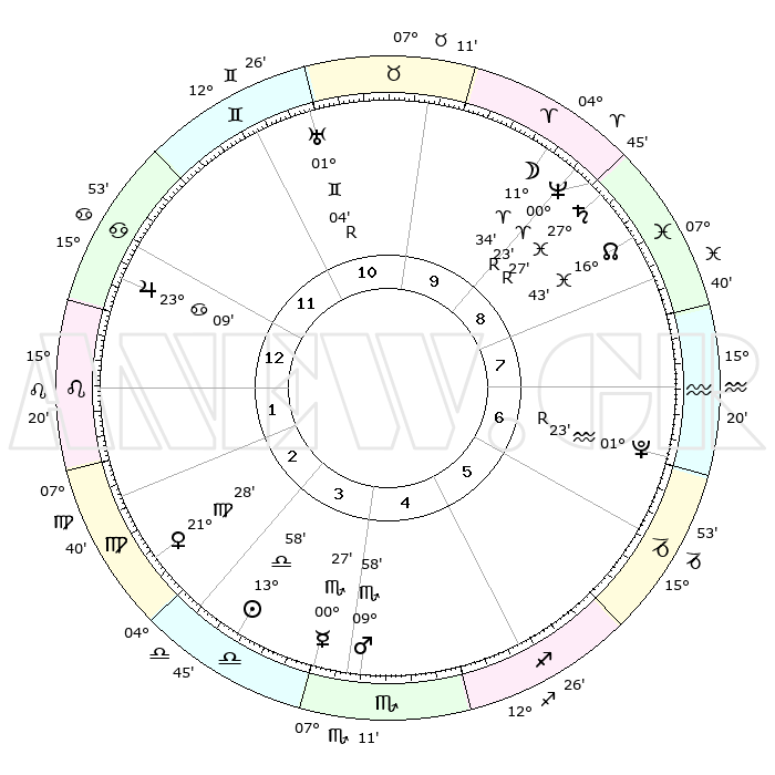 | ΘΕΣΕΙΣ ΠΛΑΝΗΤΩΝ ΑΣΤΡΟΛΟΓΙΚΟΥ ΧΑΡΤΗ ΤΗΣ ΣΤΙΓΜΗΣ ΑΥΤΗΣ | | Πλανήτης | Ζώδιο | Μοίρες | Δεκαήμ. | Σε οίκο | Απόκλιση | | Ακμές των οίκων | Ηλιος | Ζυγός | 13°53' | Δεύτερο | 4 | 05 S 29 | | 1ος | 19°19' | Καρκίνος | Σελήνη | Κριός | 10°15' | Δεύτερο | 10 | 05 N 52 | | 2ος | 09°50' | Λέων | Ερμής | Σκορπιός | 00°19' | Πρώτο | 4 | 12 S 20 | | 3ος | 03°30' | Παρθένος | Αφροδίτη | Παρθένος | 21°21' | Τρίτο | 3 | 04 N 43 | | 4ος | 03°00' | Ζυγός | Αρης | Σκορπιός | 09°54' | Πρώτο | 5 | 14 S 55 | | 5ος | 08°58' | Σκορπιός | Δίας | Καρκίνος | 23°09' | Τρίτο | 1 | 21 N 29 | | 6ος | 16°28' | Τοξότης | Κρόνος | Ιχθείς | 27°27'R | Τρίτο | 9 | 03 S 19 | | 7ος | 19°19' | Αιγόκερως | Ουρανός | Δίδυμοι | 01°04'R | Πρώτο | 11 | 20 N 10 | | 8ος | 09°50' | Υδροχόος | Ποσειδώνας | Κριός | 00°23'R | Πρώτο | 9 | 01 S 06 | | 9ος | 03°30' | Ιχθείς | Πλούτωνας | Υδροχόος | 01°23'R | Πρώτο | 7 | 23 S 32 | | 10ος | 03°00' | Κριός | Β. Δεσμός | Ιχθείς | 16°44' | Δεύτερο | 9 | 05 S 14 | | 11ος | 08°58' | Ταύρος | Ωροσκόπος | Καρκίνος | 19°19' | Δεύτερο | | | 12ος | 16°28' | Δίδυμοι | Μεσουράνημα | Κριός | 03°00' | Πρώτο | | | |