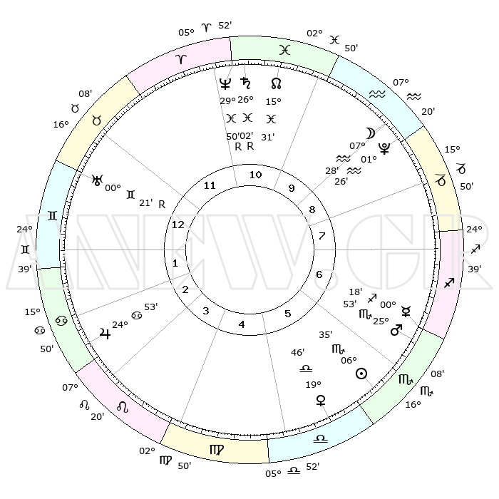 | | ΘΕΣΕΙΣ ΠΛΑΝΗΤΩΝ ΑΣΤΡΟΛΟΓΙΚΟΥ ΧΑΡΤΗ ΤΗΣ ΣΤΙΓΜΗΣ ΑΥΤΗΣ | | | | Πλανήτης | Ζώδιο | Μοίρες | Δεκαήμ. | Σε οίκο | Απόκλιση | | Ακμές των οίκων | | Ηλιος | Σκορπιός | 06°08' | Πρώτο | 11 | 13 S 34 | | 1ος | 10°09' | Τοξότης | | Σελήνη | Υδροχόος | 01°57' | Πρώτο | 2 | 23 S 16 | | 2ος | 12°54' | Αιγόκερως | | Ερμής | Σκορπιός | 29°52' | Τρίτο | 12 | 22 S 54 | | 3ος | 20°19' | Υδροχόος | | Αφροδίτη | Ζυγός | 19°14' | Δεύτερο | 10 | 06 S 08 | | 4ος | 26°18' | Ιχθείς | | Αρης | Σκορπιός | 25°34' | Τρίτο | 12 | 19 S 30 | | 5ος | 25°53' | Κριός | | Δίας | Καρκίνος | 24°52' | Τρίτο | 8 | 21 N 14 | | 6ος | 19°37' | Ταύρος | | Κρόνος | Ιχθείς | 26°03'R | Τρίτο | 3 | 03 S 50 | | 7ος | 10°09' | Δίδυμοι | | Ουρανός | Δίδυμοι | 00°22'R | Πρώτο | 6 | 20 N 01 | | 8ος | 12°54' | Καρκίνος | | Ποσειδώνας | Ιχθείς | 29°51'R | Τρίτο | 4 | 01 S 19 | | 9ος | 20°19' | Λέων | | Πλούτωνας | Υδροχόος | 01°25' | Πρώτο | 2 | 23 S 31 | | 10ος | 26°18' | Παρθένος | | Β. Δεσμός | Ιχθείς | 15°32' | Δεύτερο | 3 | 05 S 42 | | 11ος | 25°53' | Ζυγός | | Ωροσκόπος | Τοξότης | 10°09' | Δεύτερο | | | 12ος | 19°37' | Σκορπιός | | Μεσουράνημα | Παρθένος | 26°18' | Τρίτο | | | |