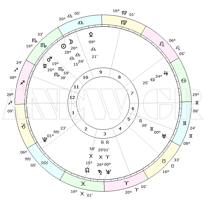 | ΘΕΣΕΙΣ ΠΛΑΝΗΤΩΝ ΑΣΤΡΟΛΟΓΙΚΟΥ ΧΑΡΤΗ ΤΗΣ ΣΤΙΓΜΗΣ ΑΥΤΗΣ | | Πλανήτης | Ζώδιο | Μοίρες | Δεκαήμ. | Σε οίκο | Απόκλιση | | Ακμές των οίκων | Ηλιος | Ζυγός | 27°54' | Τρίτο | 2 | 10 S 43 | | 1ος | 13°14' | Παρθένος | Σελήνη | Ζυγός | 22°42' | Τρίτο | 2 | 11 S 34 | | 2ος | 08°25' | Ζυγός | Ερμής | Σκορπιός | 20°11' | Τρίτο | 3 | 20 S 01 | | 3ος | 08°04' | Σκορπιός | Αφροδίτη | Ζυγός | 08°54' | Πρώτο | 2 | 02 S 07 | | 4ος | 11°01' | Τοξότης | Αρης | Σκορπιός | 19°44' | Δεύτερο | 3 | 17 S 56 | | 5ος | 14°27' | Αιγόκερως | Δίας | Καρκίνος | 24°24' | Τρίτο | 11 | 21 N 18 | | 6ος | 15°35' | Υδροχόος | Κρόνος | Ιχθείς | 26°30'R | Τρίτο | 7 | 03 S 41 | | 7ος | 13°14' | Ιχθείς | Ουρανός | Δίδυμοι | 00°40'R | Πρώτο | 9 | 20 N 05 | | 8ος | 08°25' | Κριός | Ποσειδώνας | Κριός | 00°02'R | Πρώτο | 7 | 01 S 15 | | 9ος | 08°04' | Ταύρος | Πλούτωνας | Υδροχόος | 01°23' | Πρώτο | 5 | 23 S 32 | | 10ος | 11°01' | Δίδυμοι | Β. Δεσμός | Ιχθείς | 15°59' | Δεύτερο | 7 | 05 S 32 | | 11ος | 14°27' | Καρκίνος | Ωροσκόπος | Παρθένος | 13°14' | Δεύτερο | | | 12ος | 15°35' | Λέων | Μεσουράνημα | Δίδυμοι | 11°01' | Δεύτερο | | | |