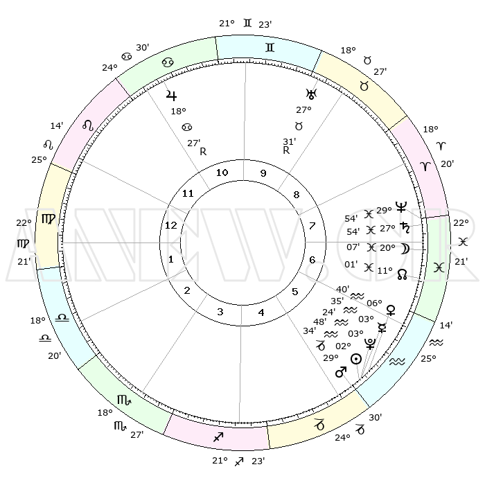 | | ΘΕΣΕΙΣ ΠΛΑΝΗΤΩΝ ΑΣΤΡΟΛΟΓΙΚΟΥ ΧΑΡΤΗ ΤΗΣ ΣΤΙΓΜΗΣ ΑΥΤΗΣ | | | | Πλανήτης | Ζώδιο | Μοίρες | Δεκαήμ. | Σε οίκο | Απόκλιση | | Ακμές των οίκων | | Ηλιος | Υδροχόος | 02°44' | Πρώτο | 5 | 19 S 33 | | 1ος | 02°11' | Παρθένος | | Σελήνη | Ιχθείς | 19°12' | Δεύτερο | 7 | 03 S 27 | | 2ος | 26°16' | Παρθένος | | Ερμής | Υδροχόος | 03°28' | Πρώτο | 5 | 21 S 23 | | 3ος | 25°08' | Ζυγός | | Αφροδίτη | Υδροχόος | 06°34' | Πρώτο | 6 | 19 S 46 | | 4ος | 28°04' | Σκορπιός | | Αρης | Αιγόκερως | 29°31' | Τρίτο | 5 | 21 S 14 | | 5ος | 02°07' | Αιγόκερως | | Δίας | Καρκίνος | 18°28'R | Δεύτερο | 11 | 22 N 27 | | 6ος | 03°54' | Υδροχόος | | Κρόνος | Ιχθείς | 27°54' | Τρίτο | 8 | 02 S 51 | | 7ος | 02°11' | Ιχθείς | | Ουρανός | Ταύρος | 27°31'R | Τρίτο | 9 | 19 N 25 | | 8ος | 26°16' | Ιχθείς | | Ποσειδώνας | Ιχθείς | 29°54' | Τρίτο | 8 | 01 S 15 | | 9ος | 25°08' | Κριός | | Πλούτωνας | Υδροχόος | 03°24' | Πρώτο | 5 | 23 S 05 | | 10ος | 28°04' | Ταύρος | | Β. Δεσμός | Ιχθείς | 11°01' | Δεύτερο | 7 | 07 S 26 | | 11ος | 02°07' | Καρκίνος | | Ωροσκόπος | Παρθένος | 02°11' | Πρώτο | | | 12ος | 03°54' | Λέων | | Μεσουράνημα | Ταύρος | 28°04' | Τρίτο | | | |