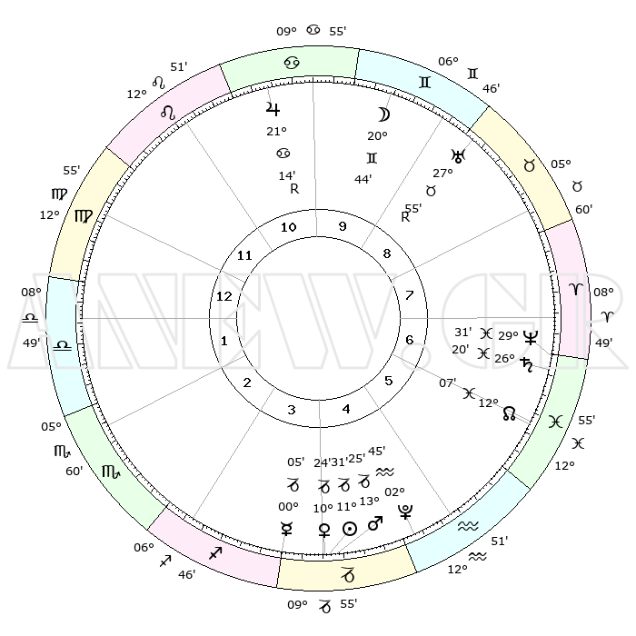 | | ΘΕΣΕΙΣ ΠΛΑΝΗΤΩΝ ΑΣΤΡΟΛΟΓΙΚΟΥ ΧΑΡΤΗ ΤΗΣ ΣΤΙΓΜΗΣ ΑΥΤΗΣ | | | | Πλανήτης | Ζώδιο | Μοίρες | Δεκαήμ. | Σε οίκο | Απόκλιση | | Ακμές των οίκων | | Ηλιος | Αιγόκερως | 11°27' | Δεύτερο | 4 | 22 S 56 | | 1ος | 17°31' | Παρθένος | | Σελήνη | Δίδυμοι | 19°39' | Δεύτερο | 10 | 28 N 01 | | 2ος | 13°06' | Ζυγός | | Ερμής | Τοξότης | 29°59' | Τρίτο | 4 | 24 S 06 | | 3ος | 12°60' | Σκορπιός | | Αφροδίτη | Αιγόκερως | 10°18' | Δεύτερο | 4 | 23 S 34 | | 4ος | 15°56' | Τοξότης | | Αρης | Αιγόκερως | 13°21' | Δεύτερο | 4 | 23 S 39 | | 5ος | 19°12' | Αιγόκερως | | Δίας | Καρκίνος | 21°14'R | Τρίτο | 11 | 22 N 00 | | 6ος | 20°07' | Υδροχόος | | Κρόνος | Ιχθείς | 26°20' | Τρίτο | 7 | 03 S 32 | | 7ος | 17°31' | Ιχθείς | | Ουρανός | Ταύρος | 27°55'R | Τρίτο | 9 | 19 N 30 | | 8ος | 13°06' | Κριός | | Ποσειδώνας | Ιχθείς | 29°31' | Τρίτο | 7 | 01 S 25 | | 9ος | 12°60' | Ταύρος | | Πλούτωνας | Υδροχόος | 02°45' | Πρώτο | 5 | 23 S 13 | | 10ος | 15°56' | Δίδυμοι | | Β. Δεσμός | Ιχθείς | 12°07' | Δεύτερο | 6 | 07 S 01 | | 11ος | 19°12' | Καρκίνος | | Ωροσκόπος | Παρθένος | 17°31' | Δεύτερο | | | 12ος | 20°07' | Λέων | | Μεσουράνημα | Δίδυμοι | 15°56' | Δεύτερο | | | |