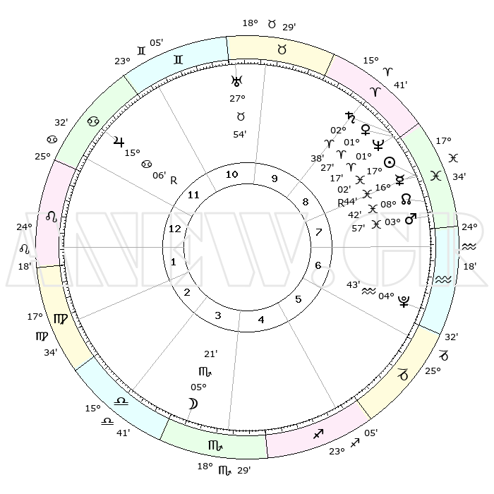 | | ΘΕΣΕΙΣ ΠΛΑΝΗΤΩΝ ΑΣΤΡΟΛΟΓΙΚΟΥ ΧΑΡΤΗ ΤΗΣ ΣΤΙΓΜΗΣ ΑΥΤΗΣ | | | | Πλανήτης | Ζώδιο | Μοίρες | Δεκαήμ. | Σε οίκο | Απόκλιση | | Ακμές των οίκων | | Ηλιος | Ιχθείς | 16°59' | Δεύτερο | 8 | 05 S 08 | | 1ος | 09°14' | Λέων | | Σελήνη | Σκορπιός | 04°43' | Πρώτο | 4 | 17 S 11 | | 2ος | 00°59' | Παρθένος | | Ερμής | Ιχθείς | 16°47'R | Δεύτερο | 8 | 01 S 52 | | 3ος | 27°17' | Παρθένος | | Αφροδίτη | Κριός | 01°23' | Πρώτο | 9 | 00 S 35 | | 4ος | 29°17' | Ζυγός | | Αρης | Ιχθείς | 03°55' | Πρώτο | 8 | 11 S 05 | | 5ος | 04°56' | Τοξότης | | Δίας | Καρκίνος | 15°06'R | Δεύτερο | 12 | 22 N 56 | | 6ος | 09°12' | Αιγόκερως | | Κρόνος | Κριός | 02°38' | Πρώτο | 9 | 00 S 54 | | 7ος | 09°14' | Υδροχόος | | Ουρανός | Ταύρος | 27°54' | Τρίτο | 10 | 19 N 31 | | 8ος | 00°59' | Ιχθείς | | Ποσειδώνας | Κριός | 01°17' | Πρώτο | 9 | 00 S 41 | | 9ος | 27°17' | Ιχθείς | | Πλούτωνας | Υδροχόος | 04°42' | Πρώτο | 6 | 22 S 51 | | 10ος | 29°17' | Κριός | | Β. Δεσμός | Ιχθείς | 08°42' | Πρώτο | 8 | 08 S 18 | | 11ος | 04°56' | Δίδυμοι | | Ωροσκόπος | Λέων | 09°14' | Πρώτο | | | 12ος | 09°12' | Καρκίνος | | Μεσουράνημα | Κριός | 29°17' | Τρίτο | | | |