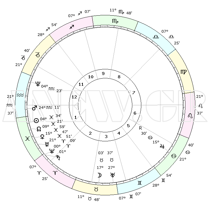 | | ΘΕΣΕΙΣ ΠΛΑΝΗΤΩΝ ΑΣΤΡΟΛΟΓΙΚΟΥ ΧΑΡΤΗ ΤΗΣ ΣΤΙΓΜΗΣ ΑΥΤΗΣ | | | | Πλανήτης | Ζώδιο | Μοίρες | Δεκαήμ. | Σε οίκο | Απόκλιση | | Ακμές των οίκων | | Ηλιος | Ιχθείς | 04°26' | Πρώτο | 2 | 09 S 53 | | 1ος | 24°31' | Τοξότης | | Σελήνη | Ταύρος | 15°01' | Δεύτερο | 5 | 20 N 57 | | 2ος | 00°19' | Υδροχόος | | Ερμής | Ιχθείς | 21°43' | Τρίτο | 3 | 01 S 25 | | 3ος | 09°49' | Ιχθείς | | Αφροδίτη | Ιχθείς | 15°48' | Δεύτερο | 3 | 06 S 55 | | 4ος | 14°34' | Κριός | | Αρης | Υδροχόος | 24°04' | Τρίτο | 2 | 14 S 32 | | 5ος | 11°46' | Ταύρος | | Δίας | Καρκίνος | 15°30'R | Δεύτερο | 7 | 22 N 52 | | 6ος | 03°59' | Δίδυμοι | | Κρόνος | Κριός | 01°08' | Πρώτο | 3 | 01 S 31 | | 7ος | 24°31' | Δίδυμοι | | Ουρανός | Ταύρος | 27°37' | Τρίτο | 5 | 19 N 27 | | 8ος | 00°19' | Λέων | | Ποσειδώνας | Κριός | 00°50' | Πρώτο | 3 | 00 S 52 | | 9ος | 09°49' | Παρθένος | | Πλούτωνας | Υδροχόος | 04°22' | Πρώτο | 2 | 22 S 54 | | 10ος | 14°34' | Ζυγός | | Β. Δεσμός | Ιχθείς | 09°22' | Πρώτο | 2 | 08 S 03 | | 11ος | 11°46' | Σκορπιός | | Ωροσκόπος | Τοξότης | 24°31' | Τρίτο | | | 12ος | 03°59' | Τοξότης | | Μεσουράνημα | Ζυγός | 14°34' | Δεύτερο | | | |