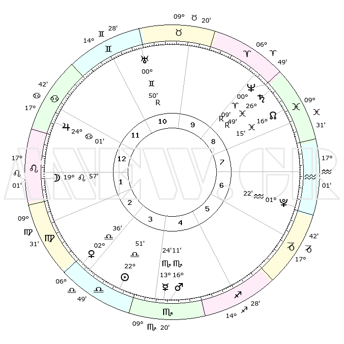 | ΘΕΣΕΙΣ ΠΛΑΝΗΤΩΝ ΑΣΤΡΟΛΟΓΙΚΟΥ ΧΑΡΤΗ ΤΗΣ ΣΤΙΓΜΗΣ ΑΥΤΗΣ | | Πλανήτης | Ζώδιο | Μοίρες | Δεκαήμ. | Σε οίκο | Απόκλιση | | Ακμές των οίκων | Ηλιος | Ζυγός | 22°44' | Τρίτο | 4 | 08 S 50 | | 1ος | 11°47' | Καρκίνος | Σελήνη | Λέων | 18°25' | Δεύτερο | 2 | 17 N 45 | | 2ος | 02°12' | Λέων | Ερμής | Σκορπιός | 13°15' | Δεύτερο | 5 | 17 S 33 | | 3ος | 25°00' | Λέων | Αφροδίτη | Ζυγός | 02°27' | Πρώτο | 4 | 00 N 25 | | 4ος | 23°17' | Παρθένος | Αρης | Σκορπιός | 16°06' | Δεύτερο | 5 | 16 S 52 | | 5ος | 28°44' | Ζυγός | Δίας | Καρκίνος | 24°00' | Τρίτο | 1 | 21 N 21 | | 6ος | 07°25' | Τοξότης | Κρόνος | Ιχθείς | 26°50'R | Τρίτο | 10 | 03 S 33 | | 7ος | 11°47' | Αιγόκερως | Ουρανός | Δίδυμοι | 00°50'R | Πρώτο | 11 | 20 N 07 | | 8ος | 02°12' | Υδροχόος | Ποσειδώνας | Κριός | 00°09'R | Πρώτο | 10 | 01 S 12 | | 9ος | 25°00' | Υδροχόος | Πλούτωνας | Υδροχόος | 01°22' | Πρώτο | 7 | 23 S 32 | | 10ος | 23°17' | Ιχθείς | Β. Δεσμός | Ιχθείς | 16°15' | Δεύτερο | 9 | 05 S 25 | | 11ος | 28°44' | Κριός | Ωροσκόπος | Καρκίνος | 11°47' | Δεύτερο | | | 12ος | 07°25' | Δίδυμοι | Μεσουράνημα | Ιχθείς | 23°17' | Τρίτο | | | |
