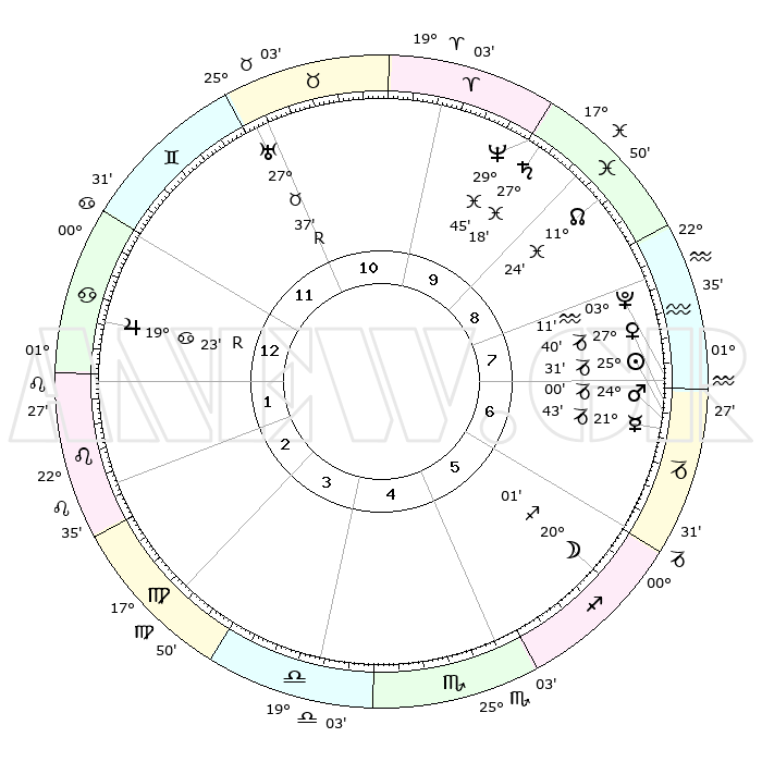 | | ΘΕΣΕΙΣ ΠΛΑΝΗΤΩΝ ΑΣΤΡΟΛΟΓΙΚΟΥ ΧΑΡΤΗ ΤΗΣ ΣΤΙΓΜΗΣ ΑΥΤΗΣ | | | | Πλανήτης | Ζώδιο | Μοίρες | Δεκαήμ. | Σε οίκο | Απόκλιση | | Ακμές των οίκων | | Ηλιος | Αιγόκερως | 25°27' | Τρίτο | 7 | 21 S 03 | | 1ος | 13°26' | Καρκίνος | | Σελήνη | Τοξότης | 19°18' | Δεύτερο | 6 | 28 S 03 | | 2ος | 03°52' | Λέων | | Ερμής | Αιγόκερως | 21°37' | Τρίτο | 7 | 23 S 30 | | 3ος | 26°50' | Λέων | | Αφροδίτη | Αιγόκερως | 27°35' | Τρίτο | 7 | 21 S 37 | | 4ος | 25°23' | Παρθένος | | Αρης | Αιγόκερως | 23°57' | Τρίτο | 7 | 22 S 16 | | 5ος | 00°59' | Σκορπιός | | Δίας | Καρκίνος | 19°24'R | Δεύτερο | 1 | 22 N 18 | | 6ος | 09°26' | Τοξότης | | Κρόνος | Ιχθείς | 27°18' | Τρίτο | 10 | 03 S 07 | | 7ος | 13°26' | Αιγόκερως | | Ουρανός | Ταύρος | 27°37'R | Τρίτο | 11 | 19 N 26 | | 8ος | 03°52' | Υδροχόος | | Ποσειδώνας | Ιχθείς | 29°45' | Τρίτο | 10 | 01 S 19 | | 9ος | 26°50' | Υδροχόος | | Πλούτωνας | Υδροχόος | 03°11' | Πρώτο | 7 | 23 S 08 | | 10ος | 25°23' | Ιχθείς | | Β. Δεσμός | Ιχθείς | 11°24' | Δεύτερο | 9 | 07 S 17 | | 11ος | 00°59' | Ταύρος | | Ωροσκόπος | Καρκίνος | 13°26' | Δεύτερο | | | 12ος | 09°26' | Δίδυμοι | | Μεσουράνημα | Ιχθείς | 25°23' | Τρίτο | | | |