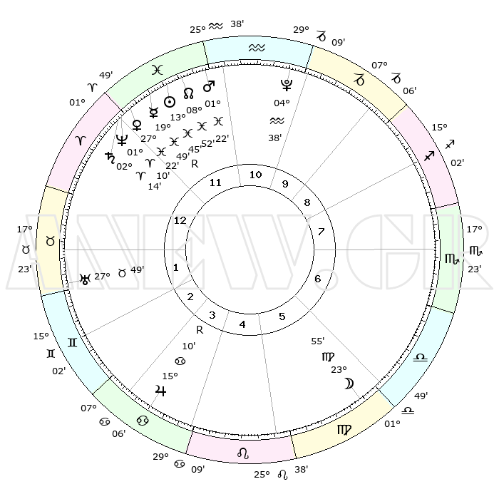 | | ΘΕΣΕΙΣ ΠΛΑΝΗΤΩΝ ΑΣΤΡΟΛΟΓΙΚΟΥ ΧΑΡΤΗ ΤΗΣ ΣΤΙΓΜΗΣ ΑΥΤΗΣ | | | | Πλανήτης | Ζώδιο | Μοίρες | Δεκαήμ. | Σε οίκο | Απόκλιση | | Ακμές των οίκων | | Ηλιος | Ιχθείς | 13°41' | Δεύτερο | 12 | 06 S 25 | | 1ος | 15°23' | Κριός | | Σελήνη | Παρθένος | 23°08' | Τρίτο | 6 | 01 N 32 | | 2ος | 21°40' | Ταύρος | | Ερμής | Ιχθείς | 19°52'R | Δεύτερο | 12 | 00 S 39 | | 3ος | 16°55' | Δίδυμοι | | Αφροδίτη | Ιχθείς | 27°17' | Τρίτο | 12 | 02 S 17 | | 4ος | 08°43' | Καρκίνος | | Αρης | Ιχθείς | 01°19' | Πρώτο | 11 | 12 S 02 | | 5ος | 01°54' | Λέων | | Δίας | Καρκίνος | 15°10'R | Δεύτερο | 4 | 22 N 55 | | 6ος | 01°51' | Παρθένος | | Κρόνος | Κριός | 02°14' | Πρώτο | 12 | 01 S 04 | | 7ος | 15°23' | Ζυγός | | Ουρανός | Ταύρος | 27°48' | Τρίτο | 2 | 19 N 30 | | 8ος | 21°40' | Σκορπιός | | Ποσειδώνας | Κριός | 01°10' | Πρώτο | 12 | 00 S 44 | | 9ος | 16°55' | Τοξότης | | Πλούτωνας | Υδροχόος | 04°37' | Πρώτο | 11 | 22 S 52 | | 10ος | 08°43' | Αιγόκερως | | Β. Δεσμός | Ιχθείς | 08°52' | Πρώτο | 12 | 08 S 14 | | 11ος | 01°54' | Υδροχόος | | Ωροσκόπος | Κριός | 15°23' | Δεύτερο | | | 12ος | 01°51' | Ιχθείς | | Μεσουράνημα | Αιγόκερως | 08°43' | Πρώτο | | | |
